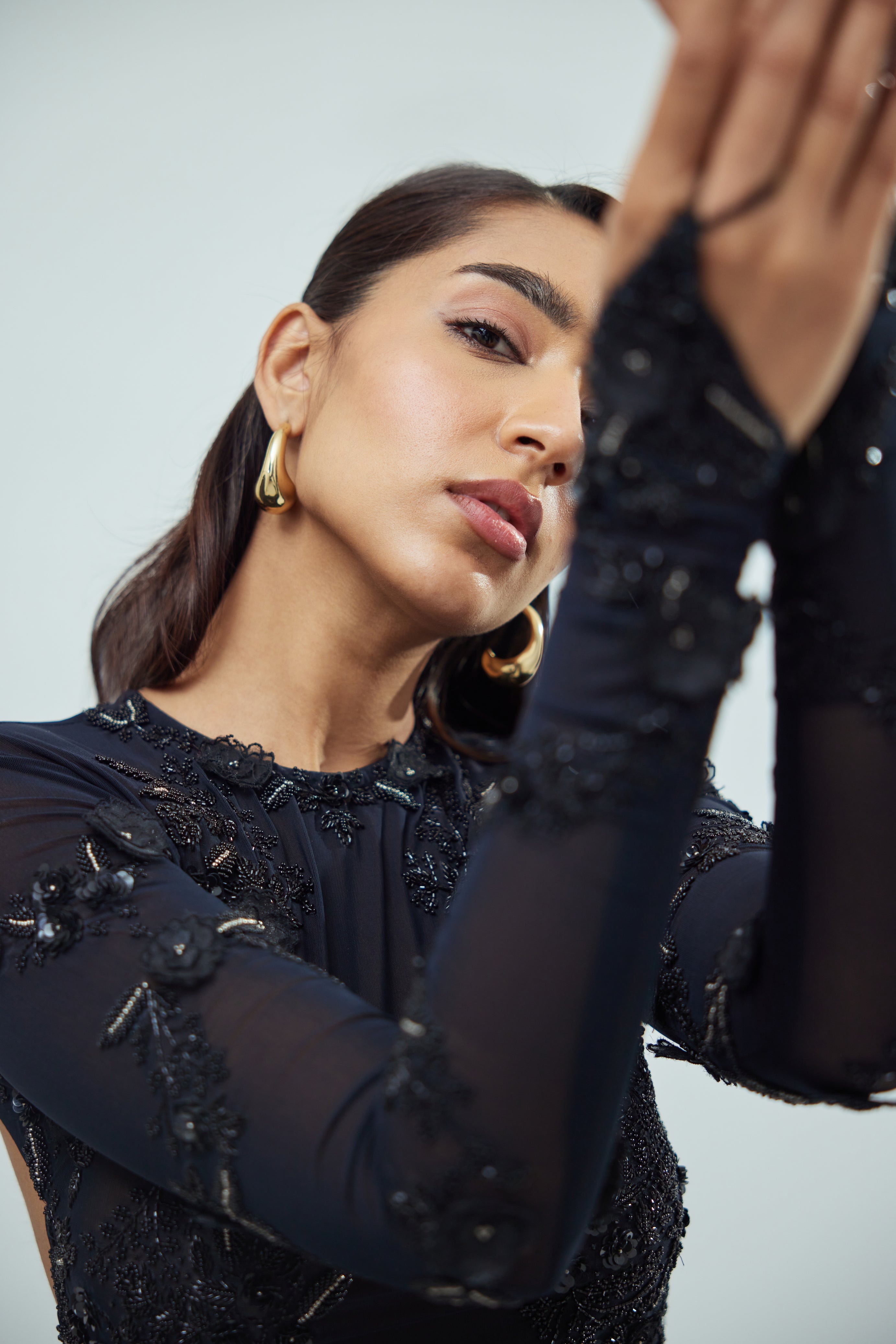 • Embroidered full-sleeves with finger loops—drama in every move
