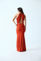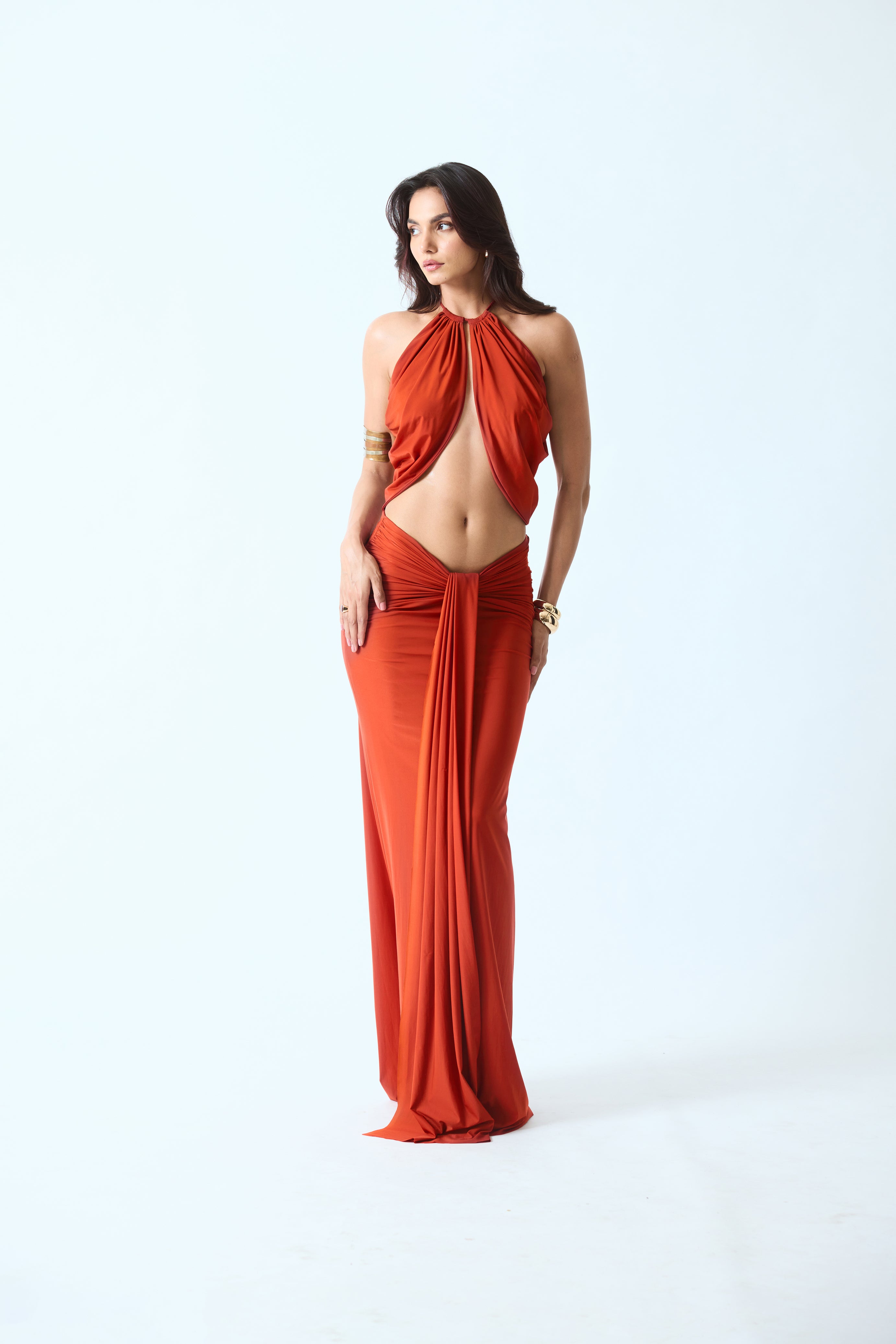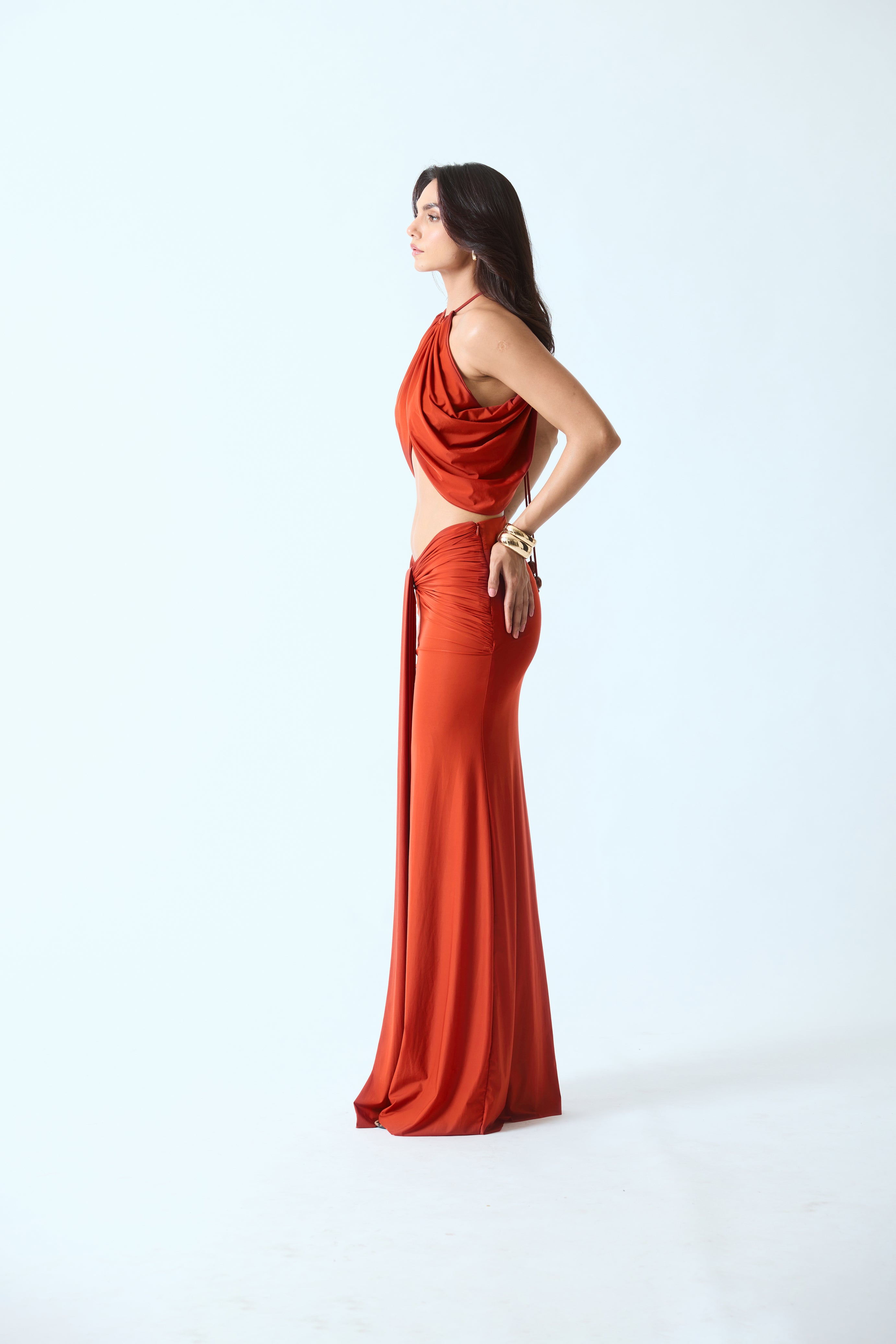 A fluid two-piece set designed with soft draping and a sculpted silhouette. The halter-style top features gathered drapes that frame the neckline and fall into an open front & back. Paired with a floor-length skirt that skims the body with a clean, elongated fall, the set balances structure with movement.