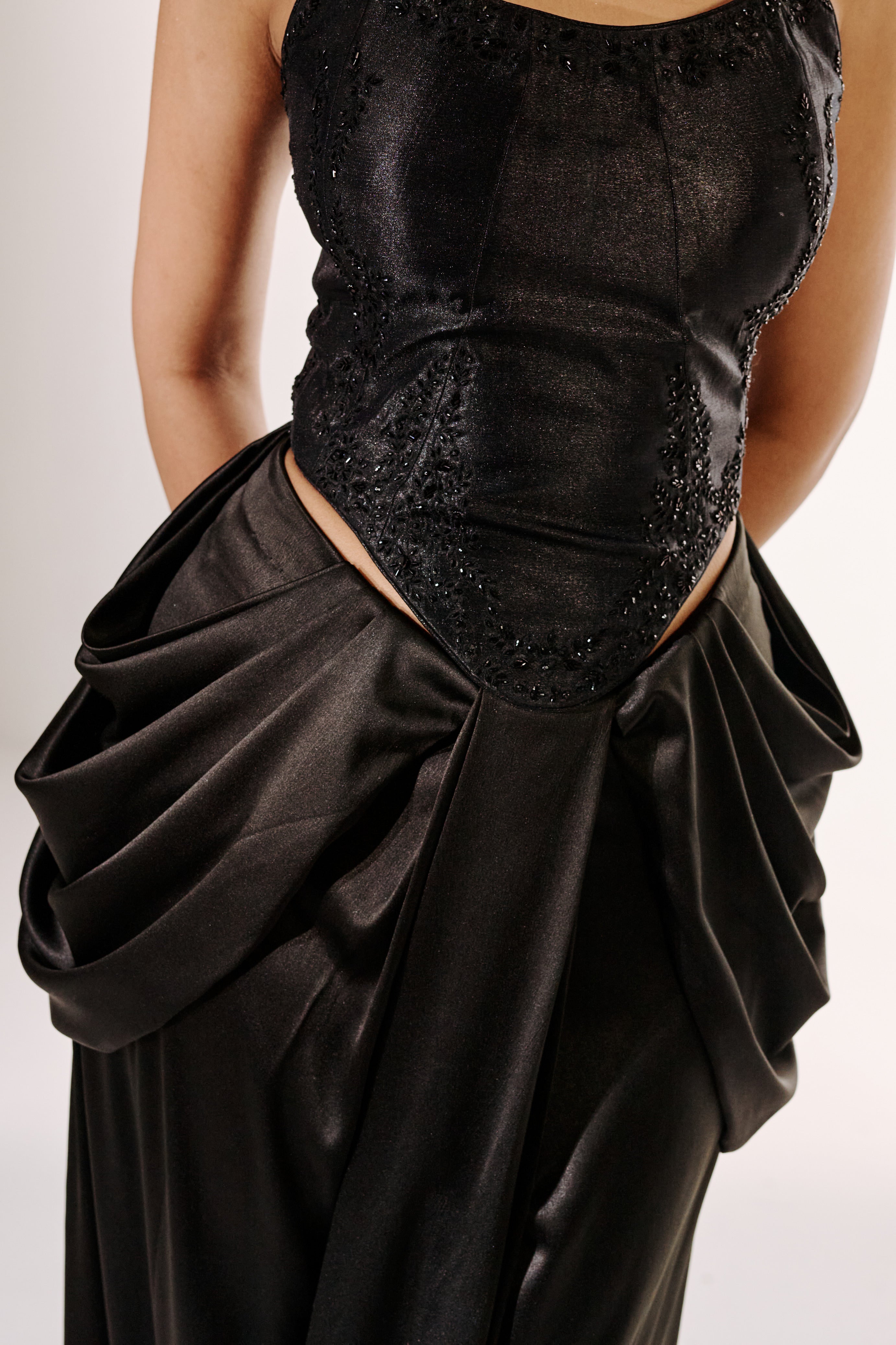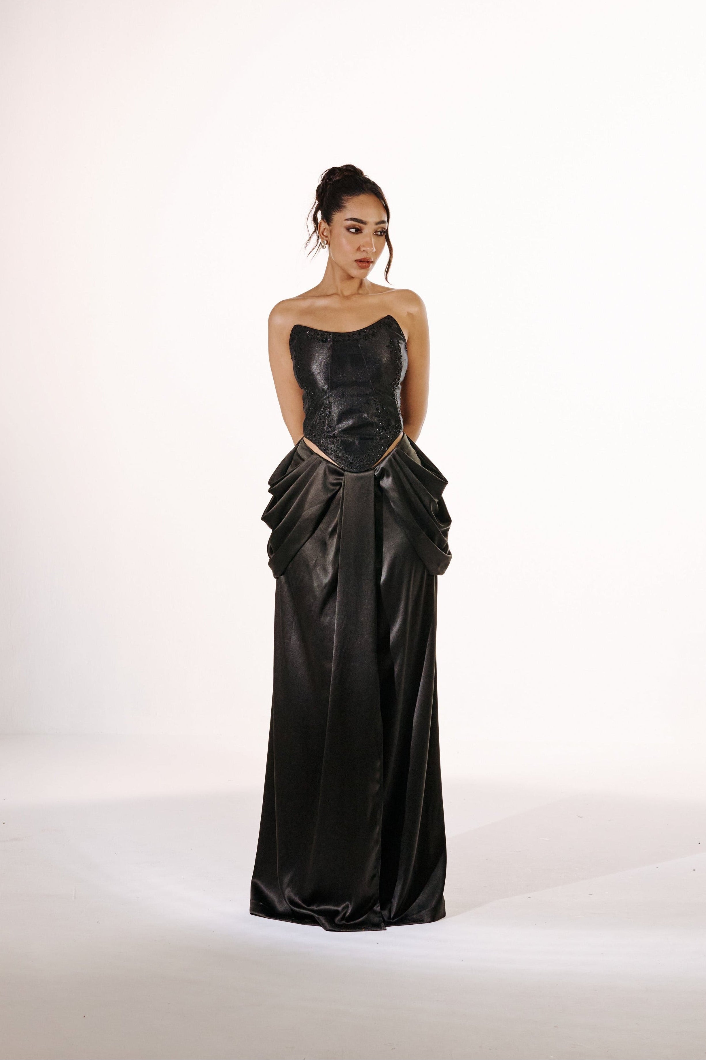 A full-length skirt crafted with structured draping at the hip dips, creating volume while maintaining a streamlined fall and giving you the perfect hourglass shape.