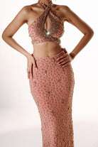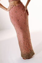 The skirt is crafted in a straight silhouette, featuring intricate handwork that adds texture and dimension throughout. Finished with a scattered embroidery effect at the hem adds a refined, statement finish.