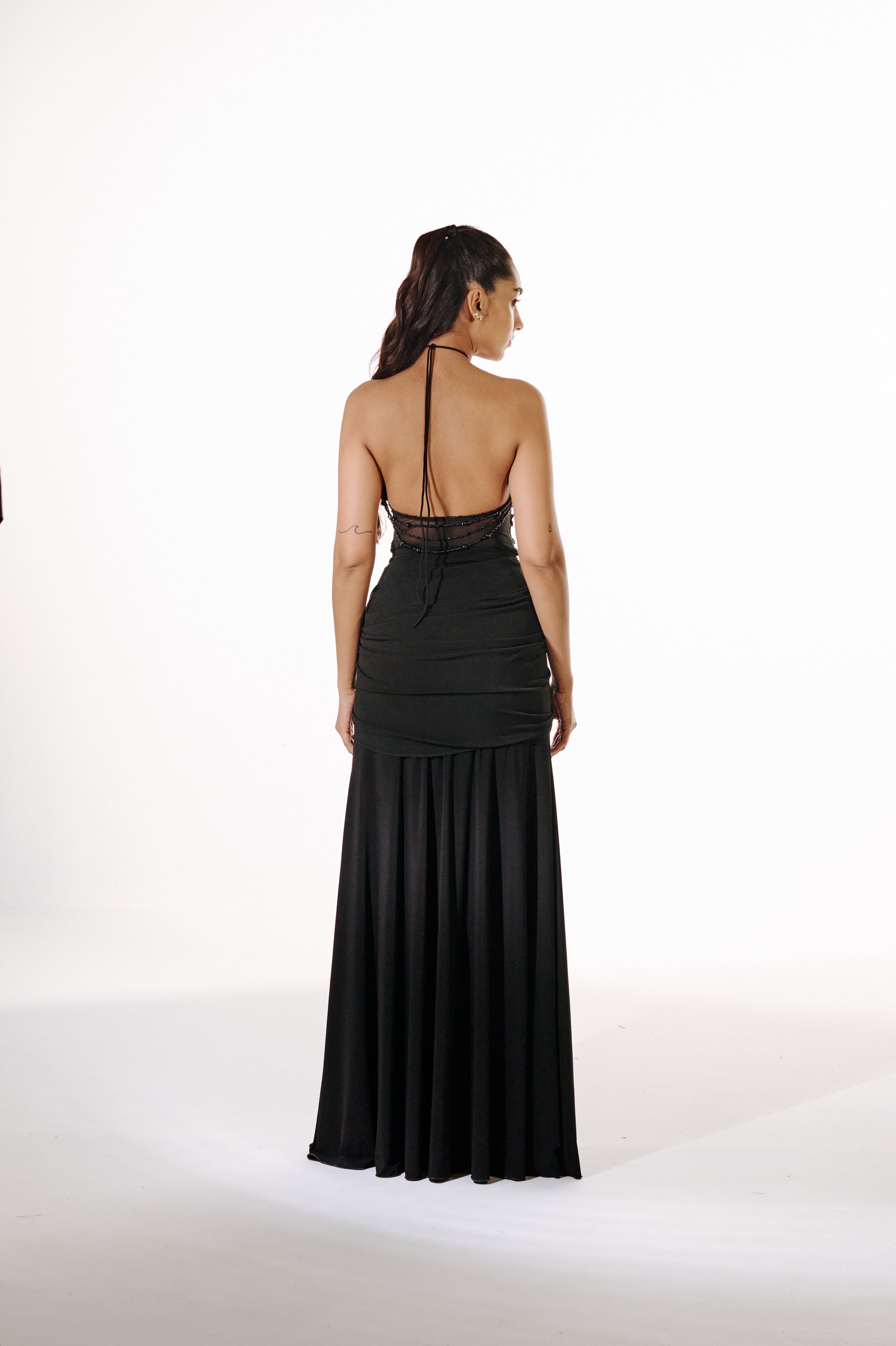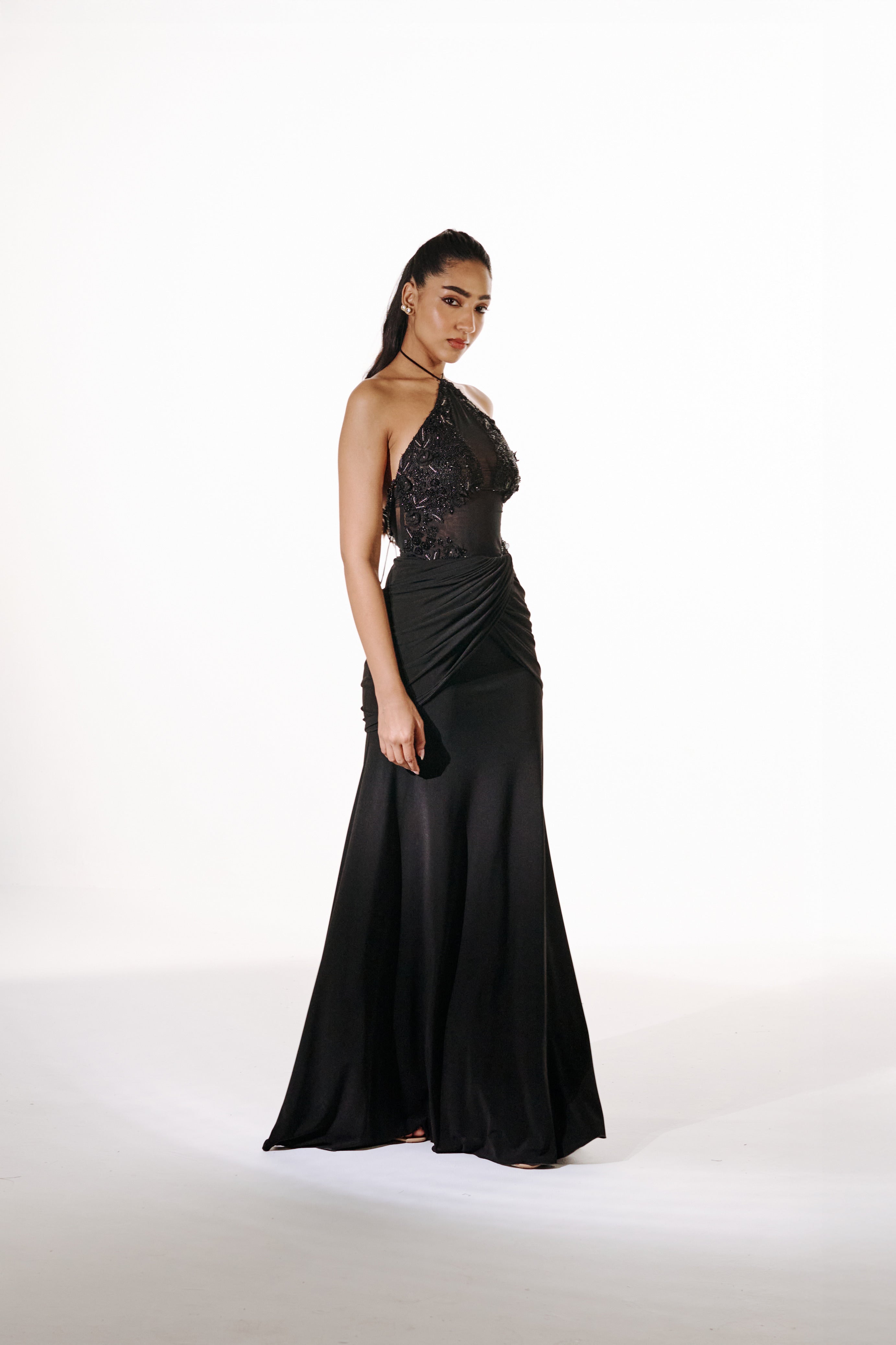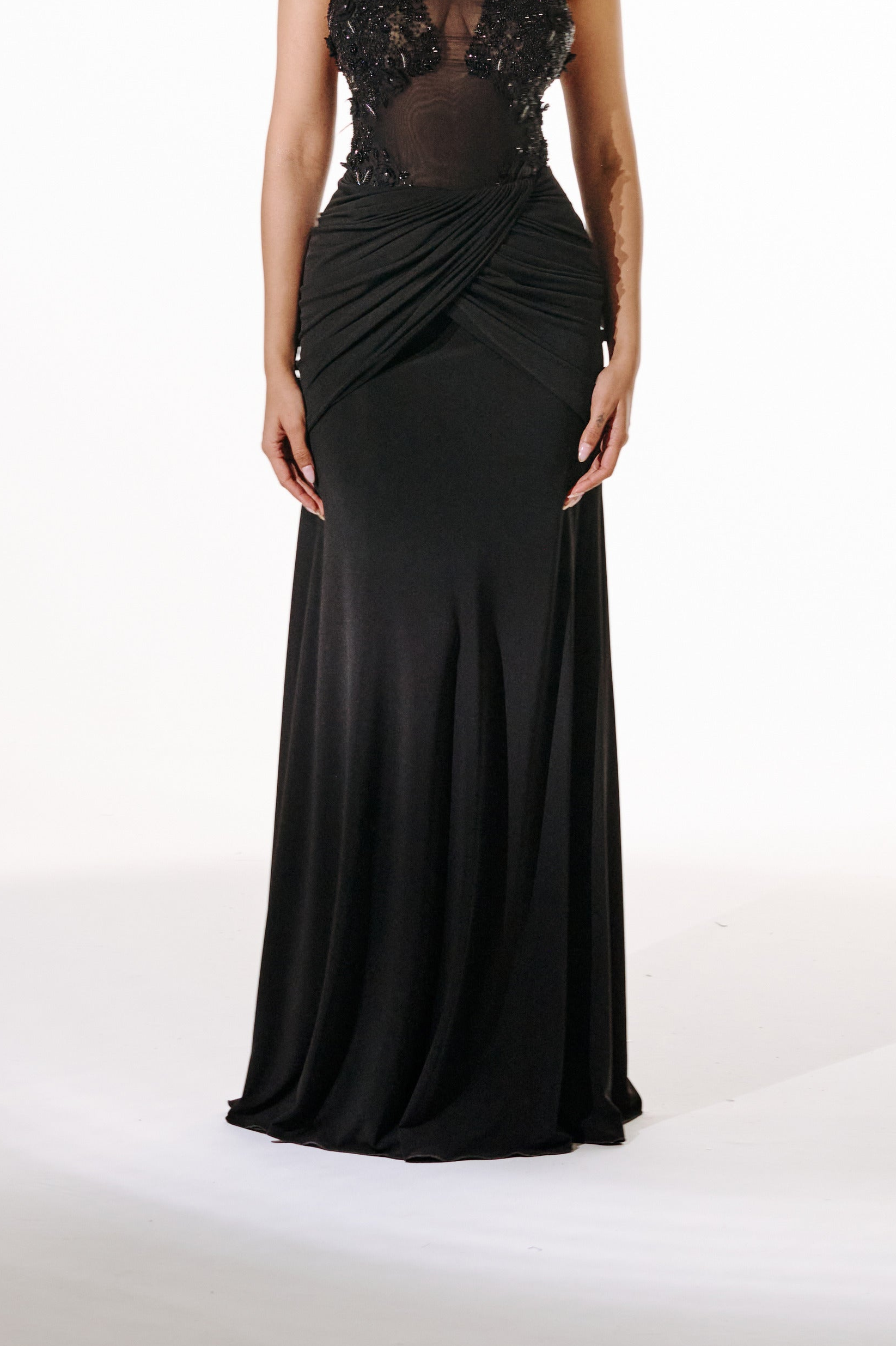 Yashvika wears a custom sample closest to S/8 — High Waist: 24", Mid Waist: 26", Hip: 38.5", Skirt Length: 46".