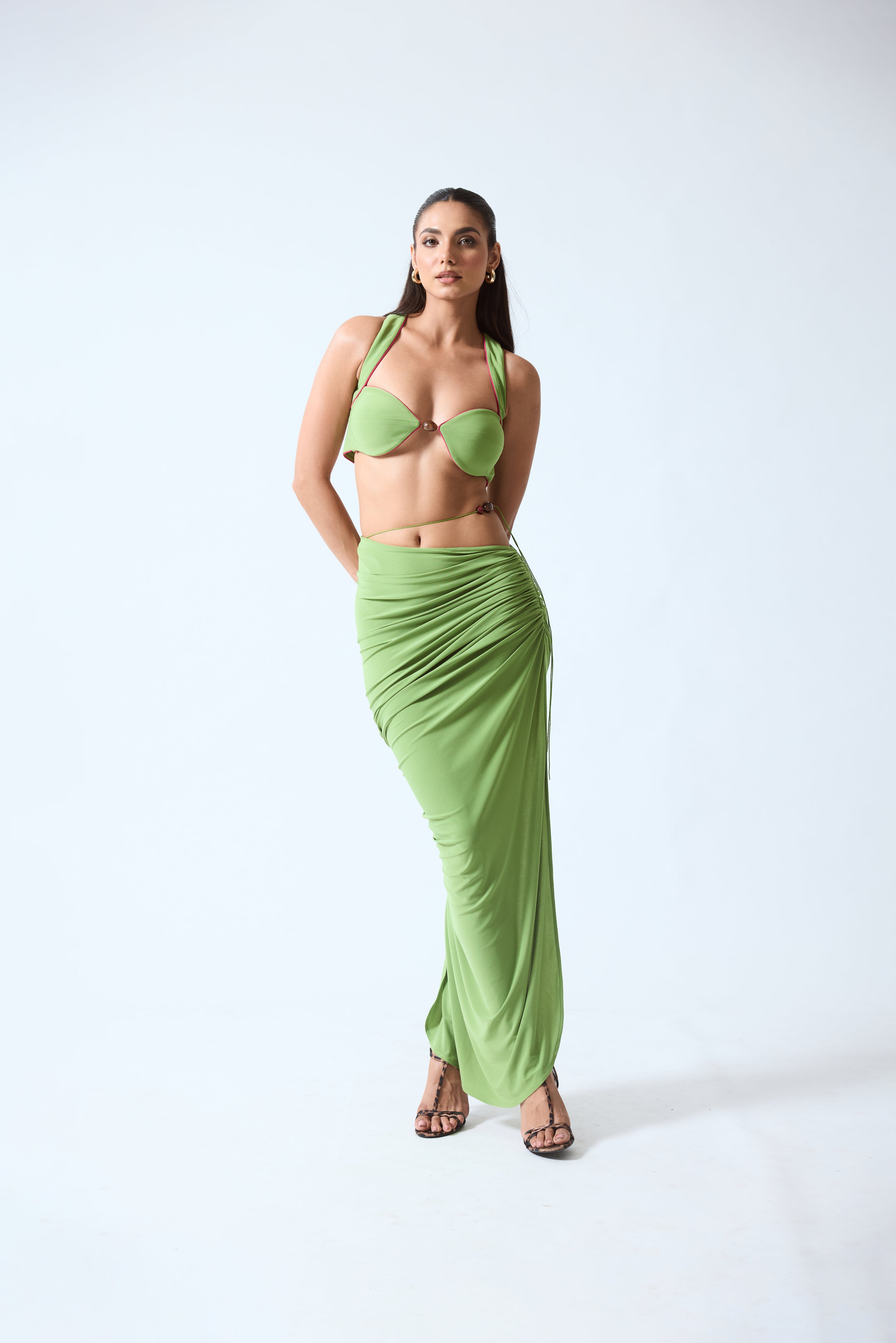 Kanchan with chest 33", high waist 24", mid waist 26" and hip 36" is wearing a custom sample closest to size XS/6.