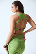 It features contrast piping that defines the silhouette, while bead accents at the centre front add a subtle statement. The open back with an adjustable beaded string allows for a customisable fit while enhancing the design’s bold, modern appeal.