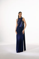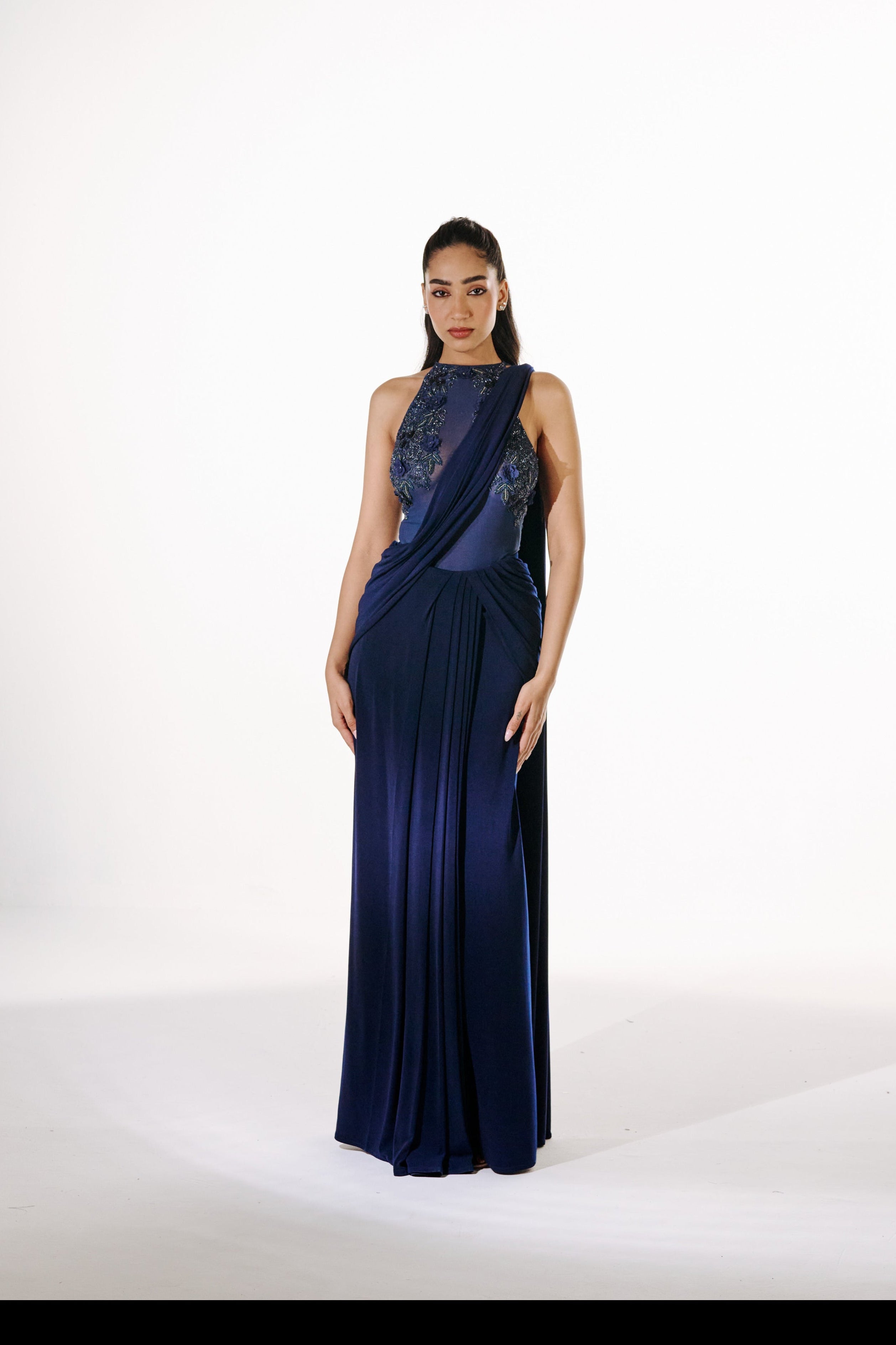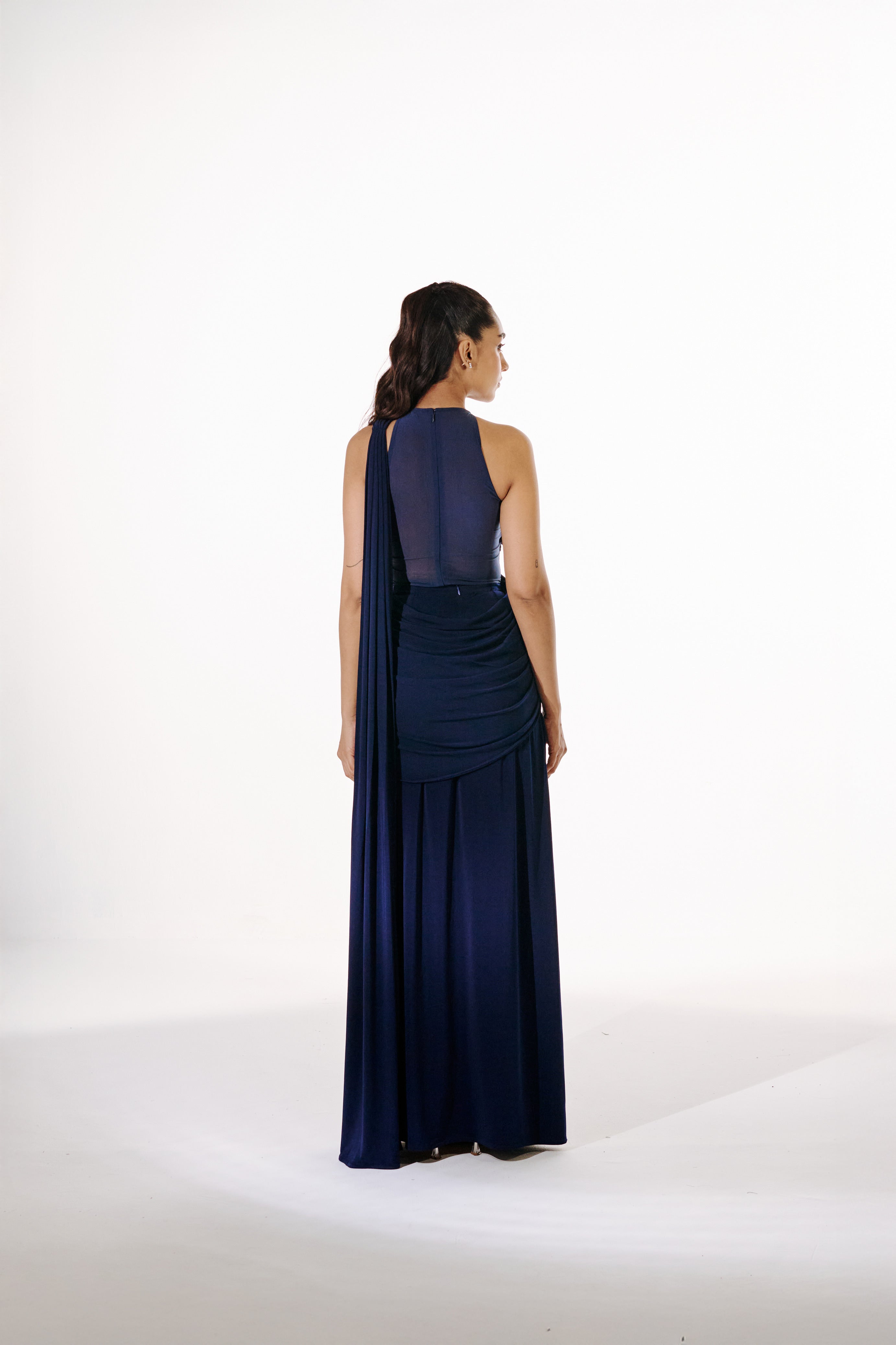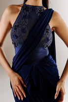 A 2-piece ensemble featuring a pre-draped sari paired with a hand-embroidered zero-neckline mesh bodysuit, creating a clean, elongated silhouette.