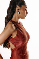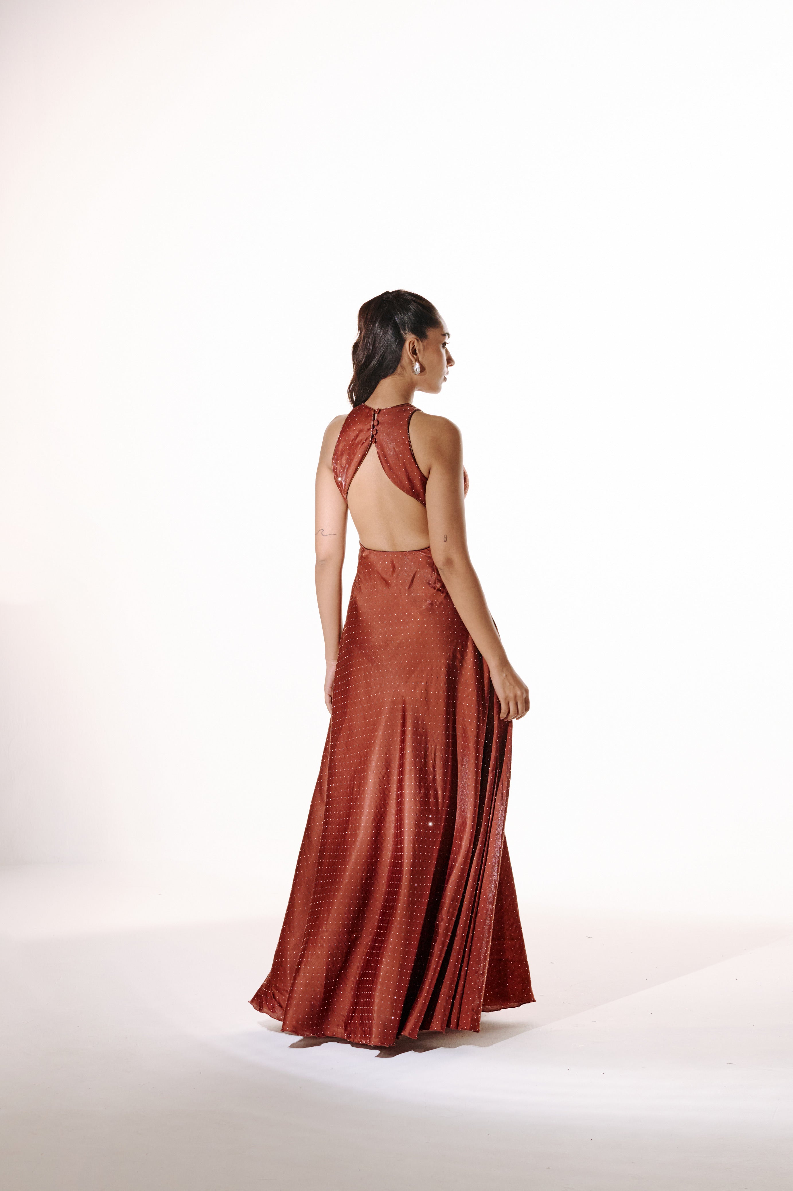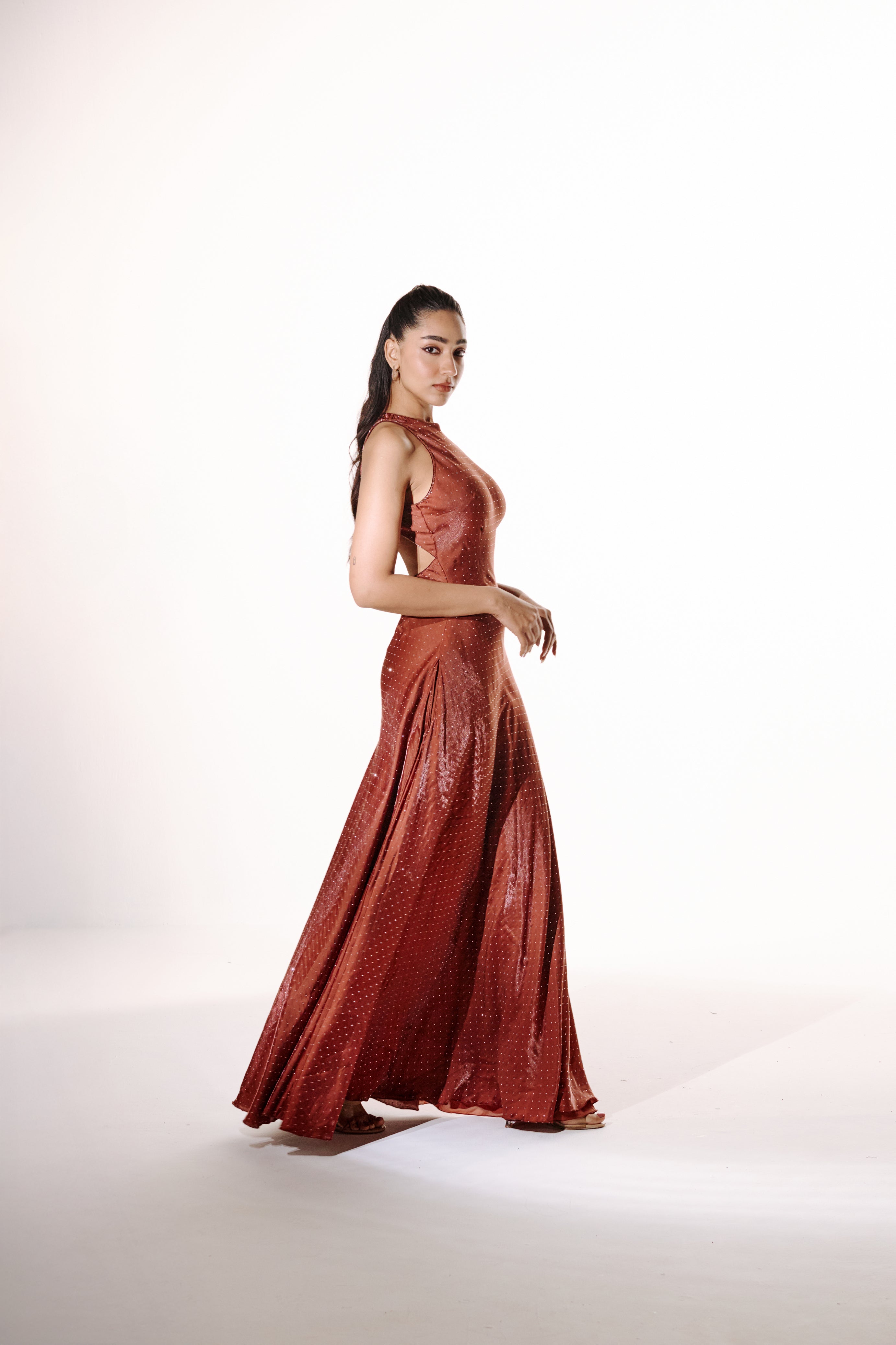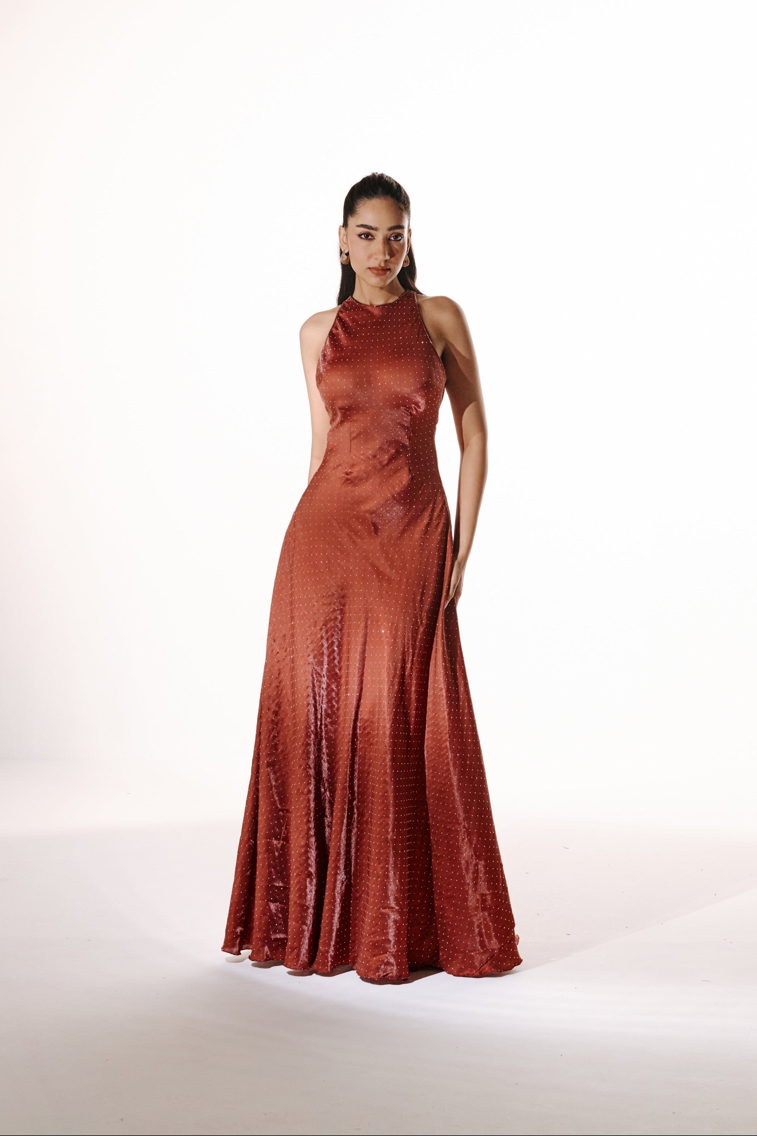 A sleek, high-neck gown cut in a gently flared silhouette, detailed with all-over rhinestones. The elongated silhouette brings effortless drama, the kind that steals the moment without trying.