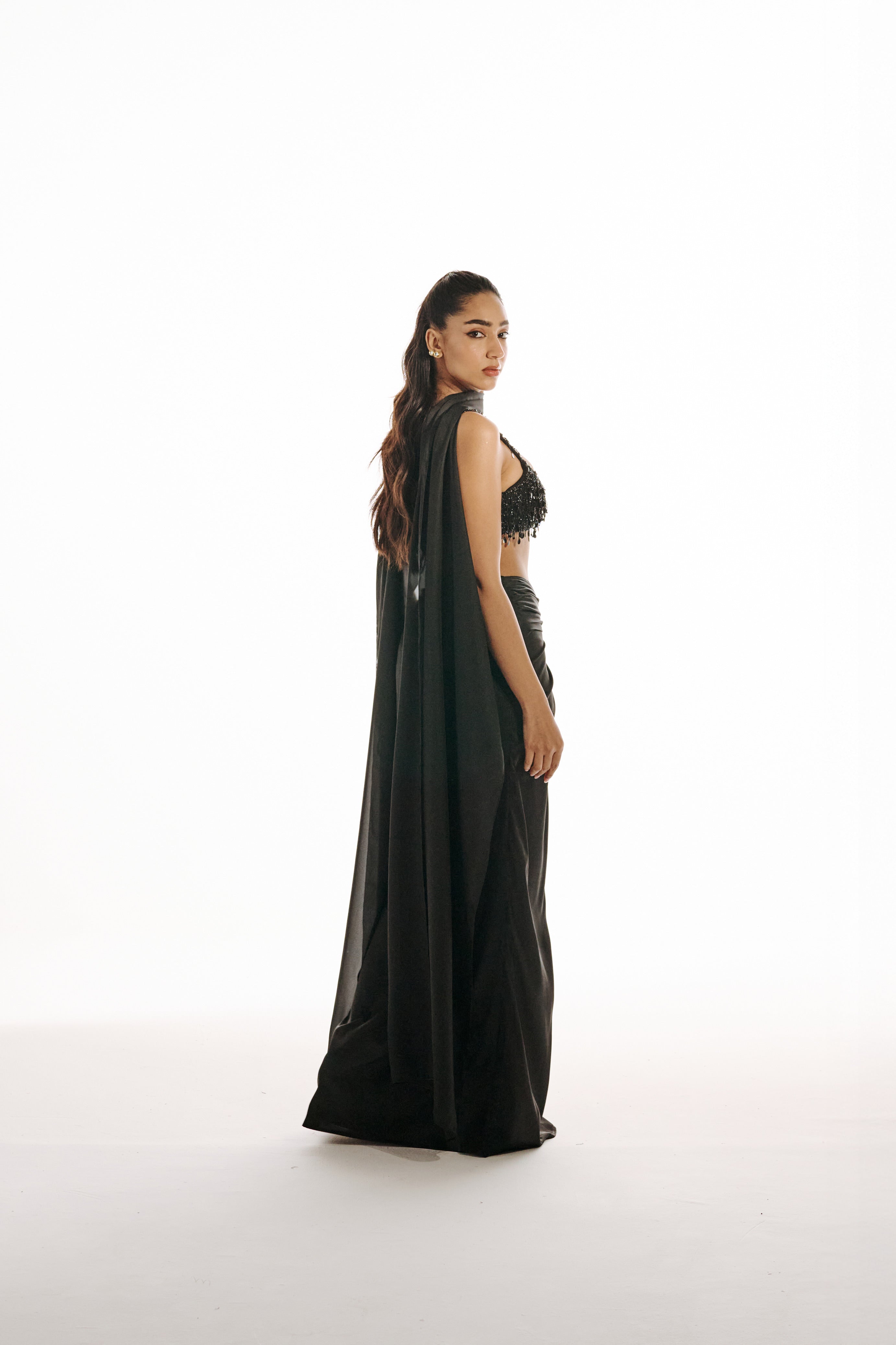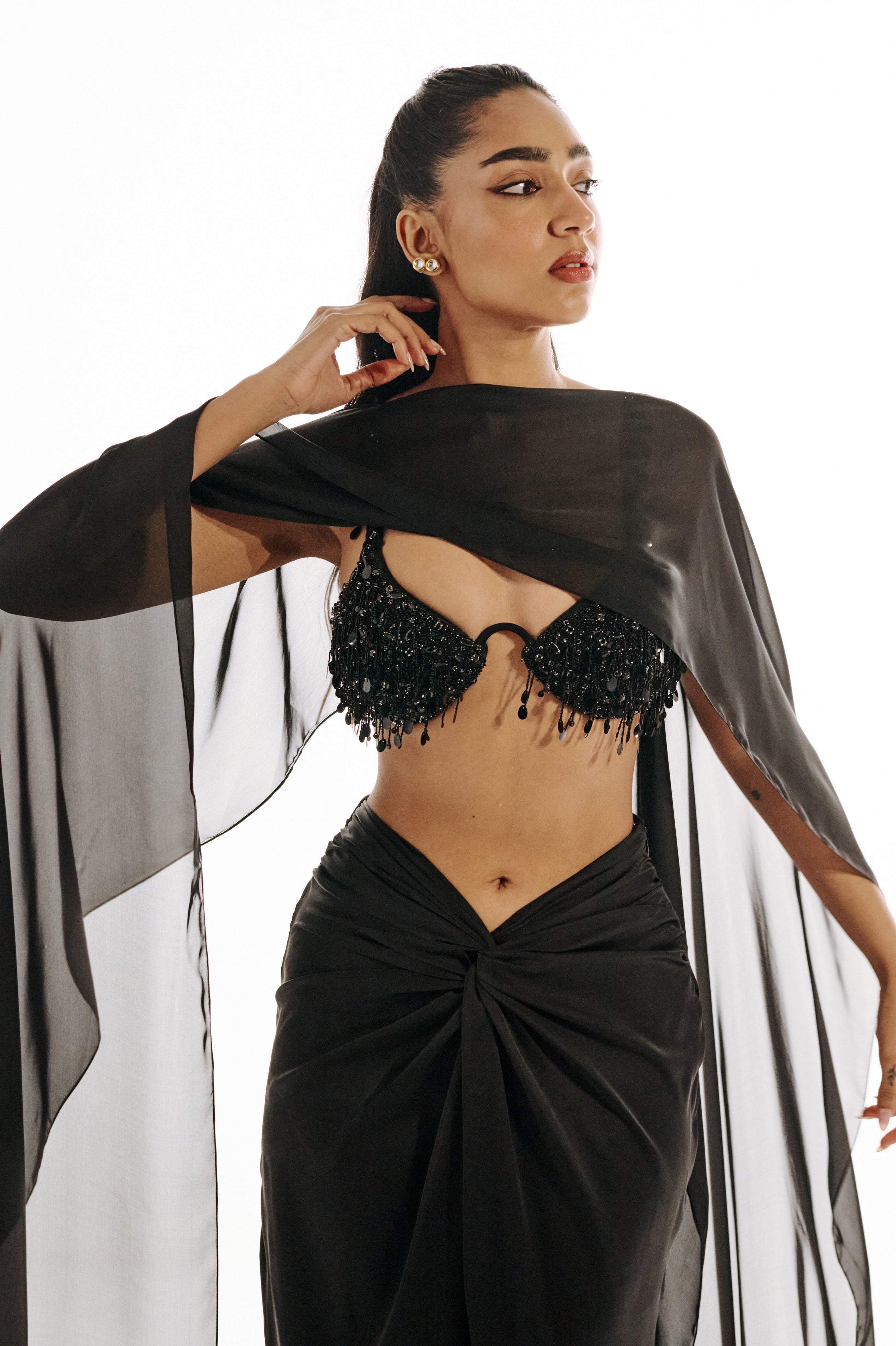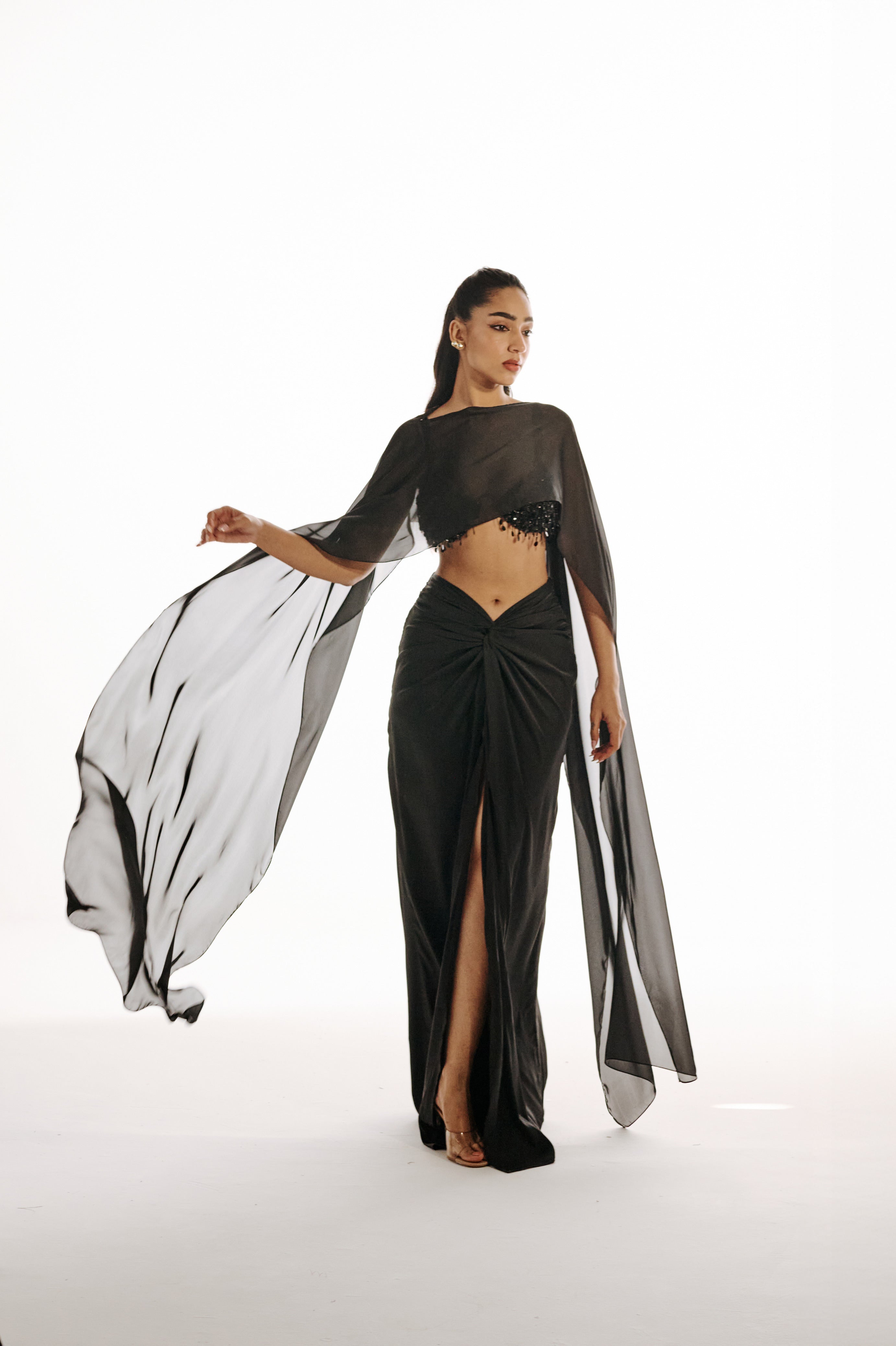 A 3 piece set featuring a draped maxi skirt with a sculpted front knot and elongated fall, paired with a hand-embellished structured bustier with beaded fringe. Finished with a sheer overlay for added depth and movement.