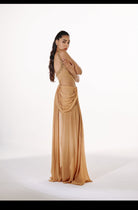 The Topaz Set pairs a side cut-out, embellished bodysuit with a light, pleated skirt featuring a draped waist, creating a balanced silhouette with structure and fluidity.