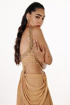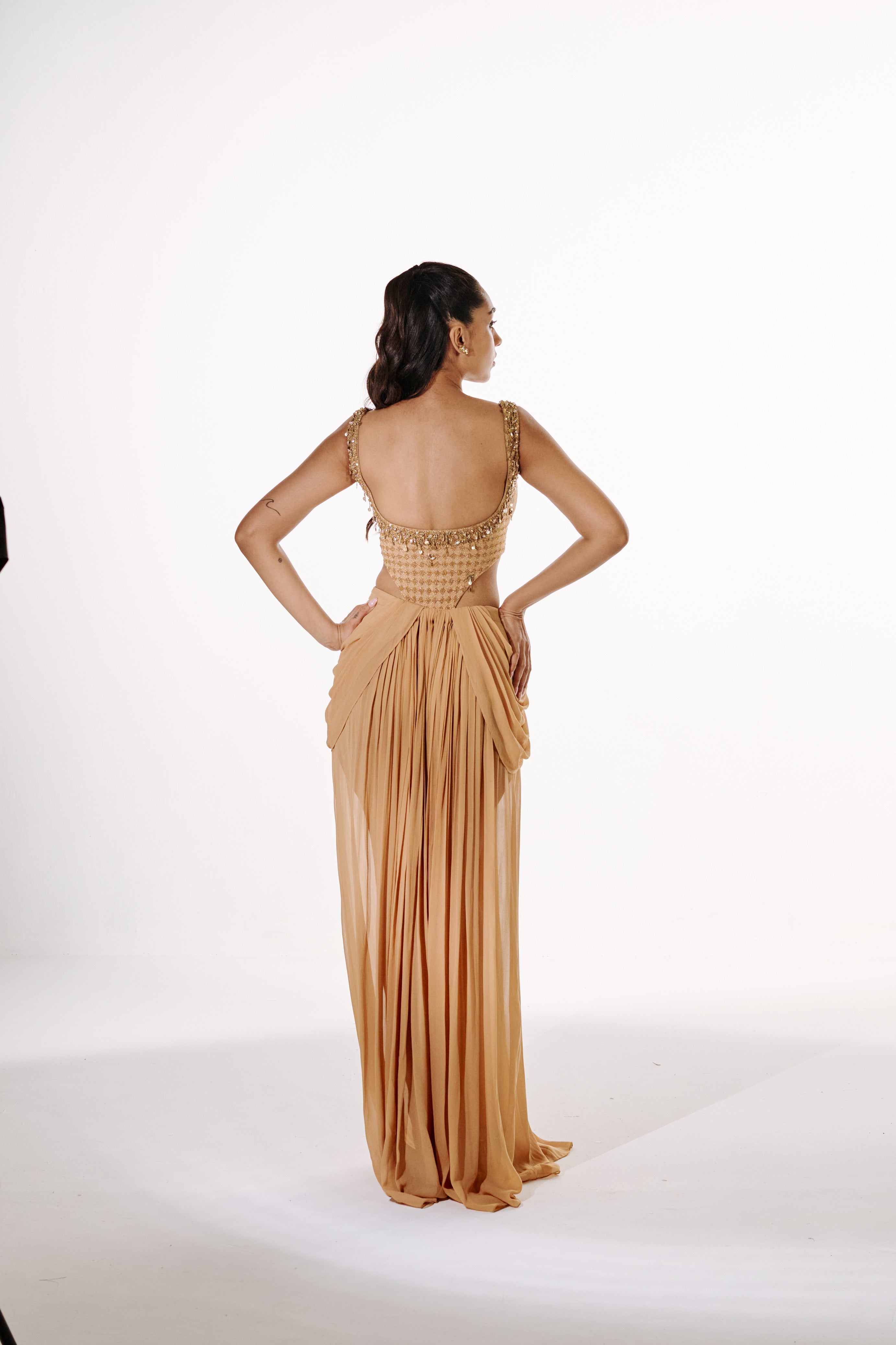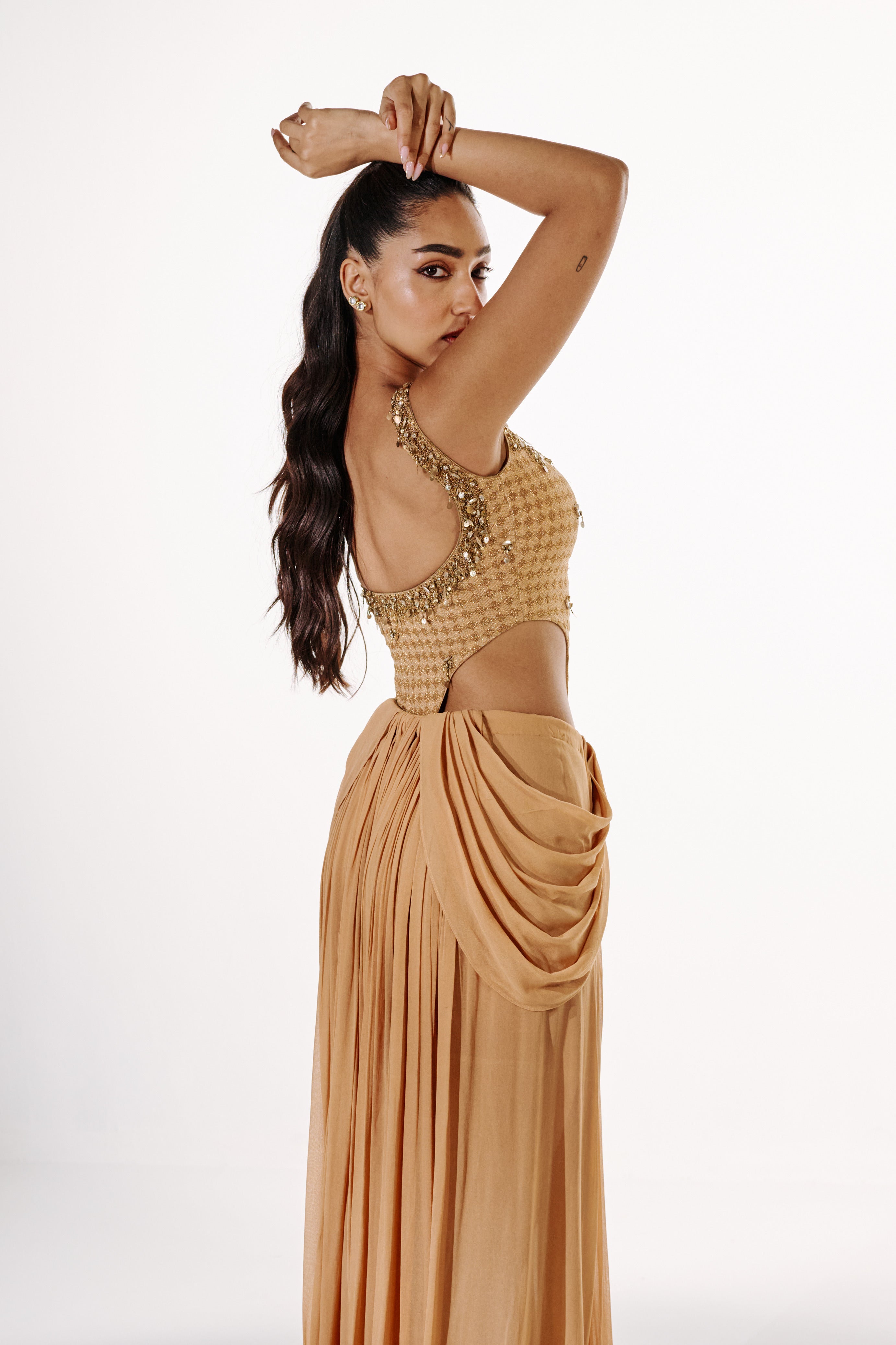 Yashvika wears a custom sample closest to S/8 — Chest: 34", High Waist: 24", Mid Waist: 26", Hip: 38.5"