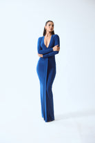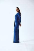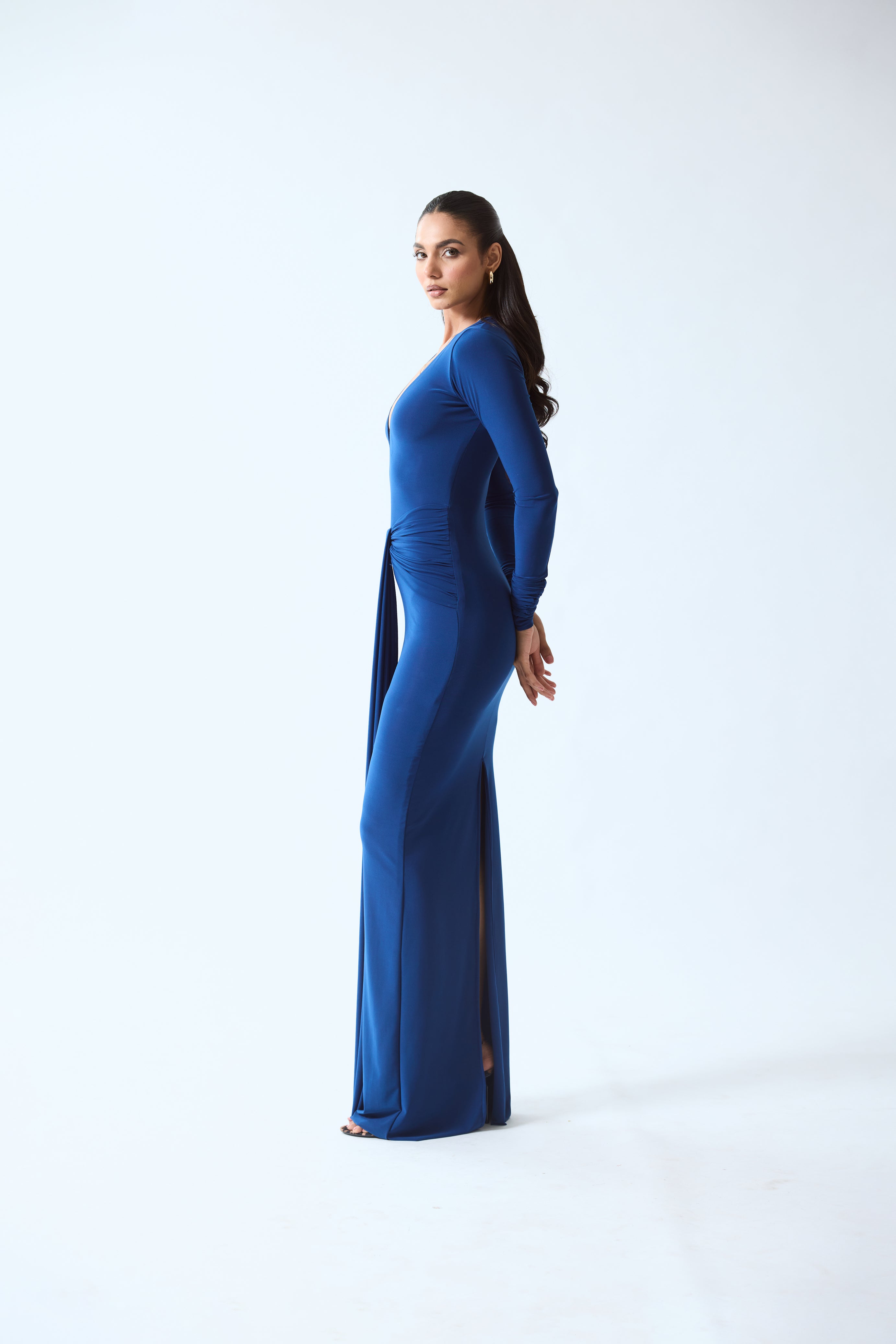 A sculpted, floor-length dress designed to highlight the body’s natural curves. It features a deep plunging neckline and full sleeves that balance the sleek, body-contouring silhouette. The clean lines and fluid fall create a refined, elongated look, while the back slit allows ease of movement.