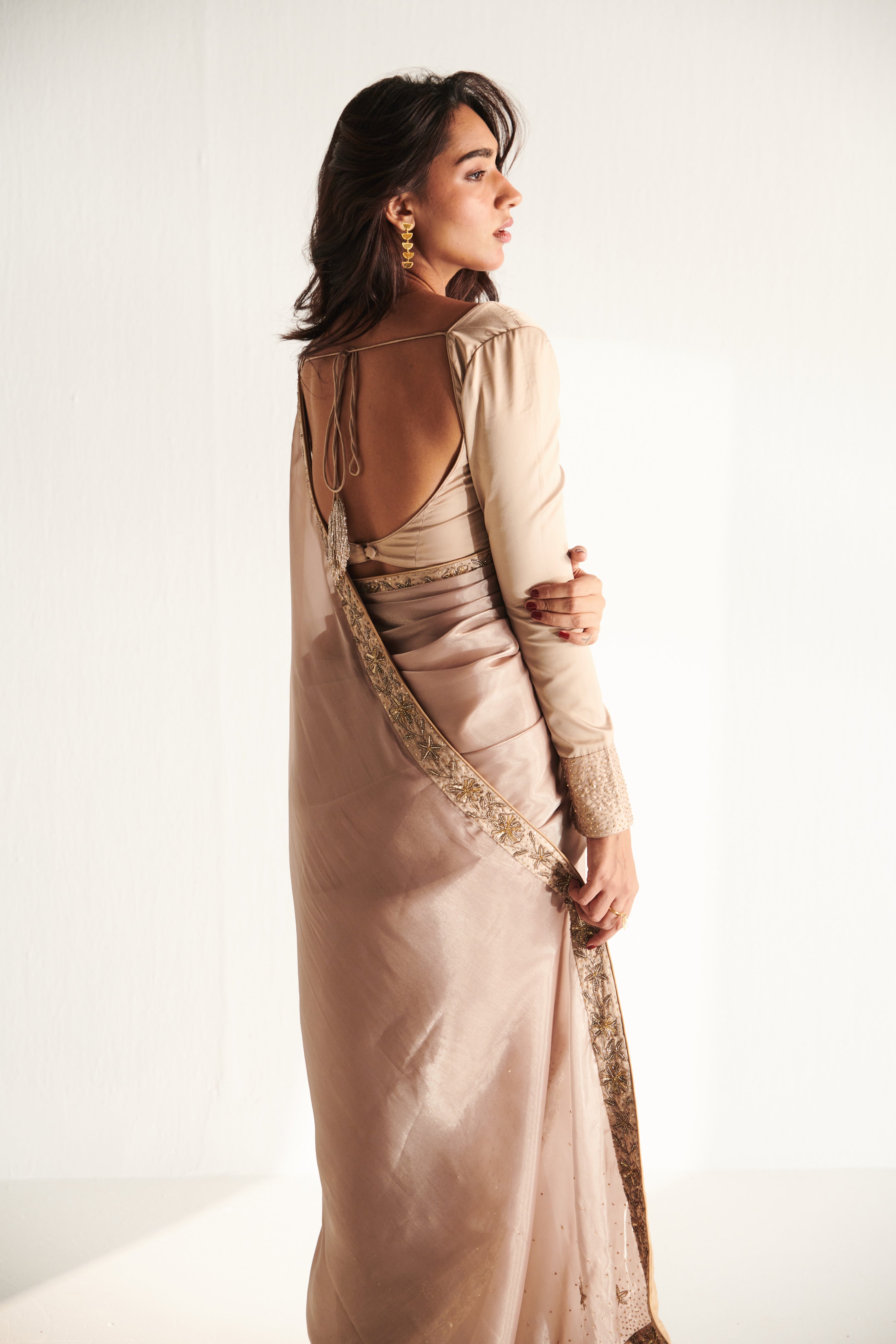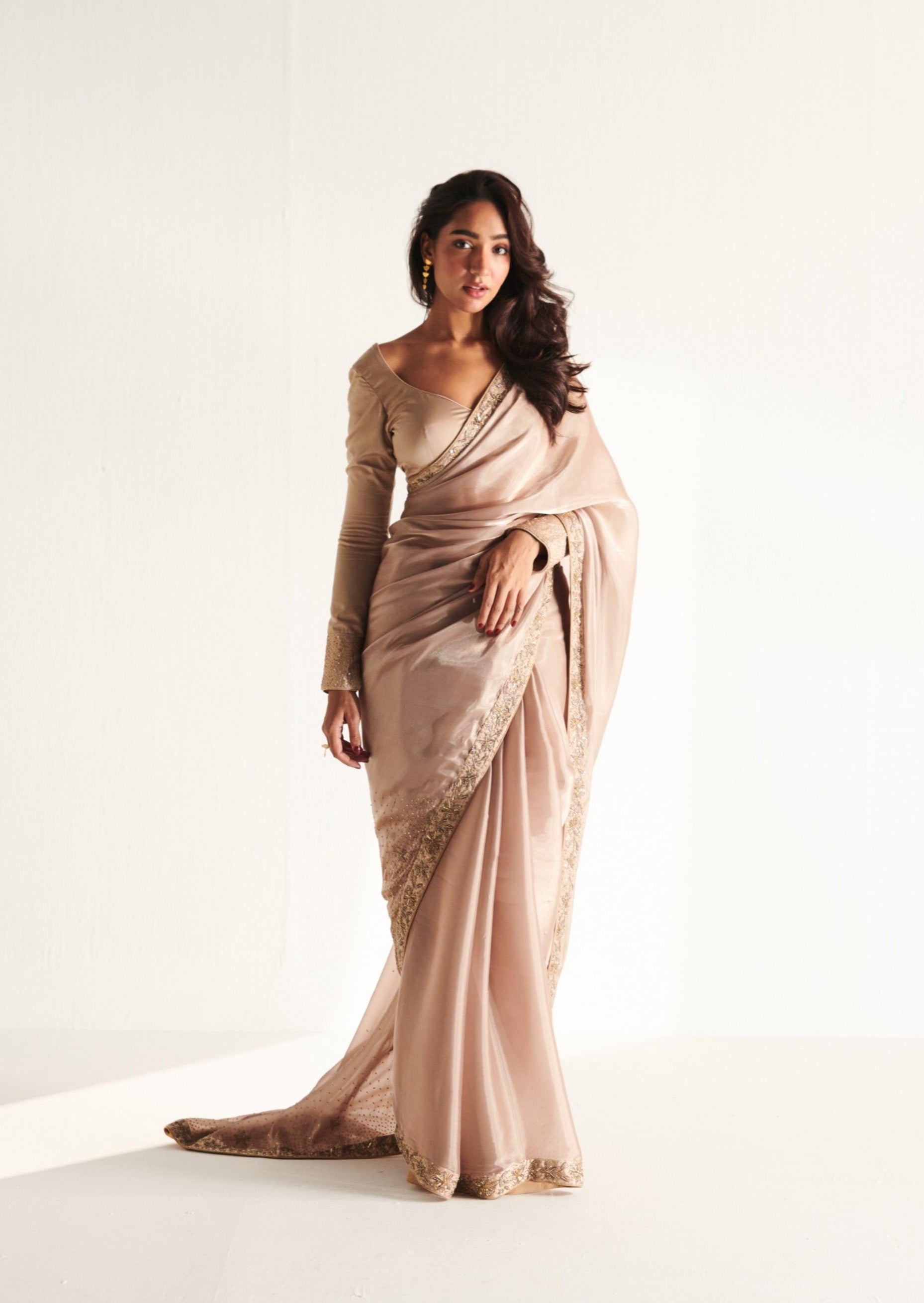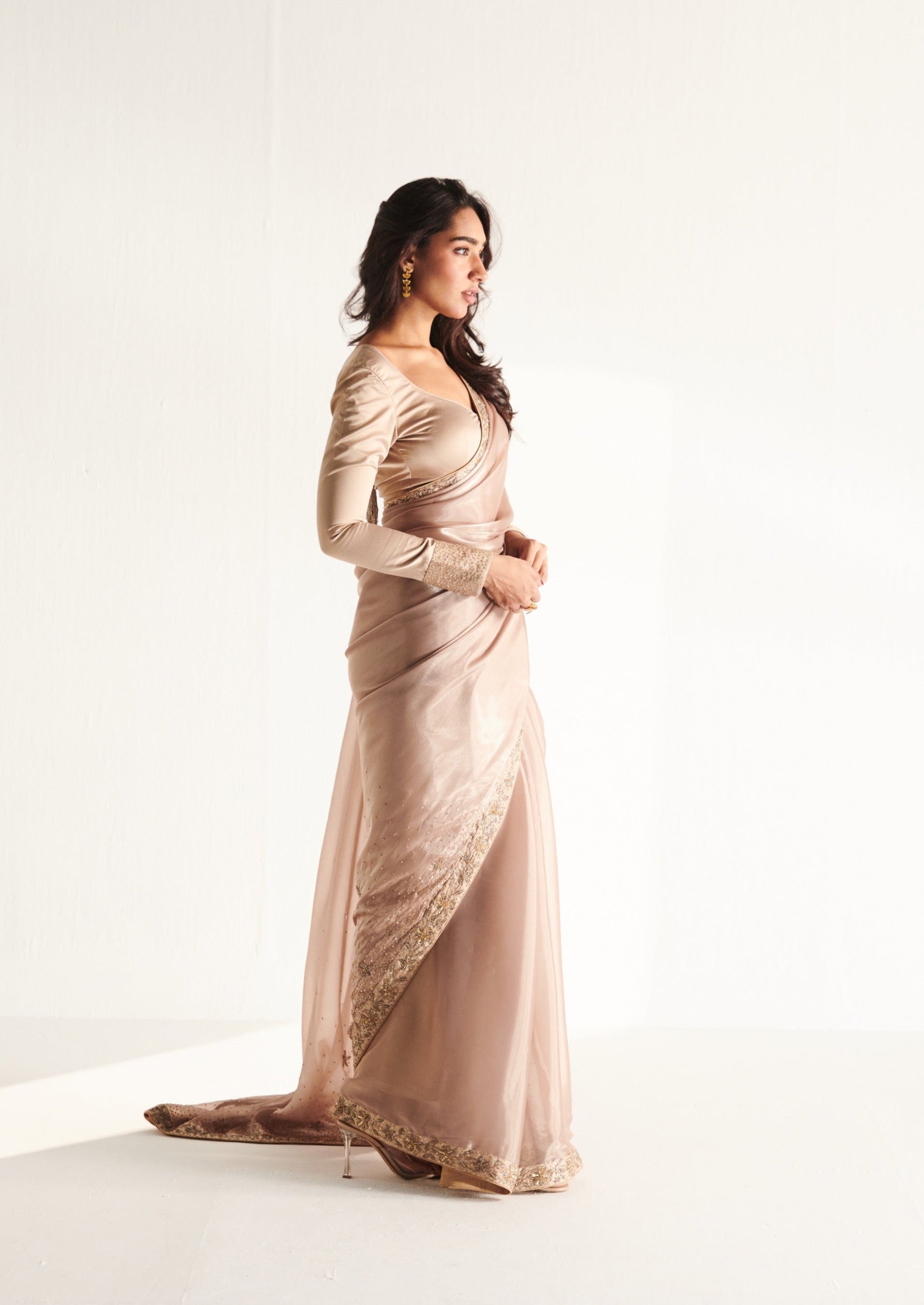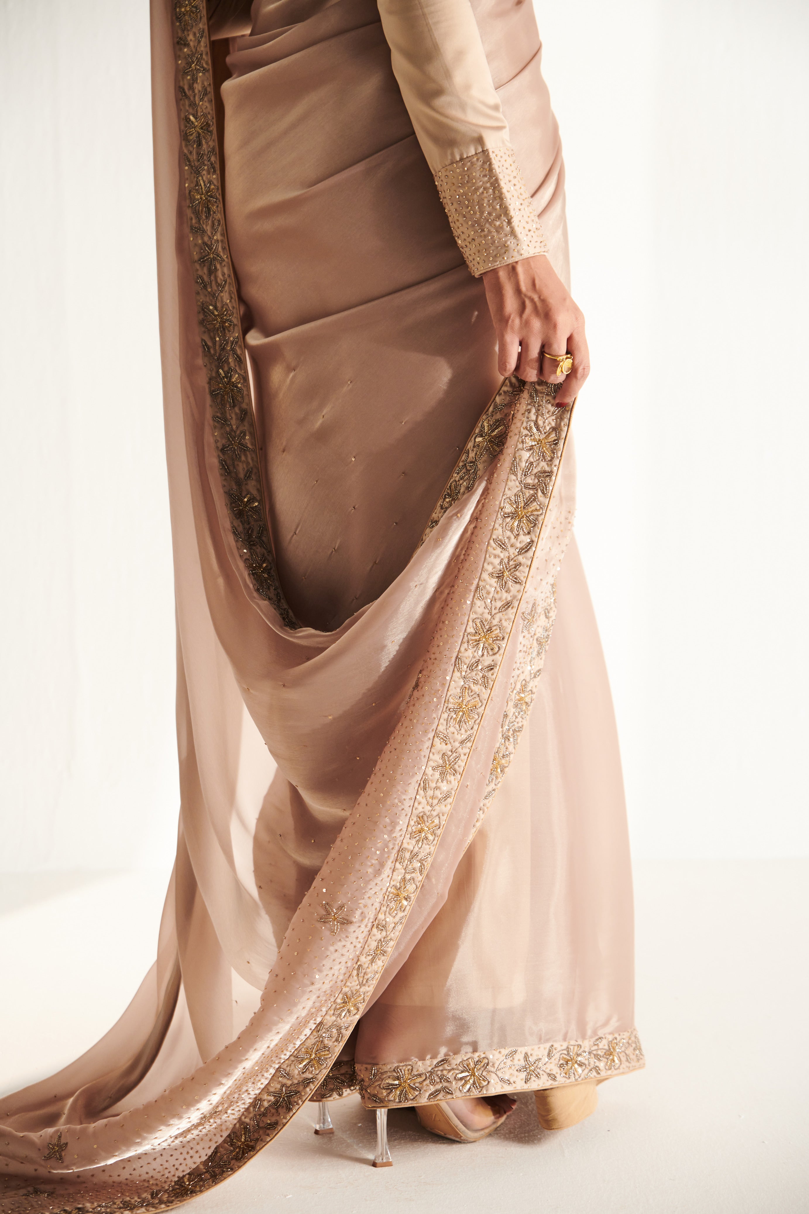 The Glit Sari is six yards of pure elegance in soft gold organza, kissed with delicate embroidery. Perfect for occasions where minimalism meets glamour.