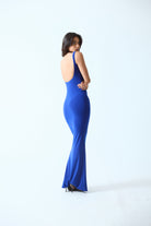 A sculpted full-length dress designed to contour the body with a sleek, minimal silhouette. Featuring delicate shoulder straps and a softly curved neckline, the design highlights clean lines with a deep scoop back.
