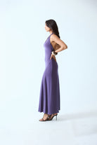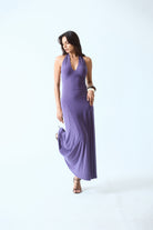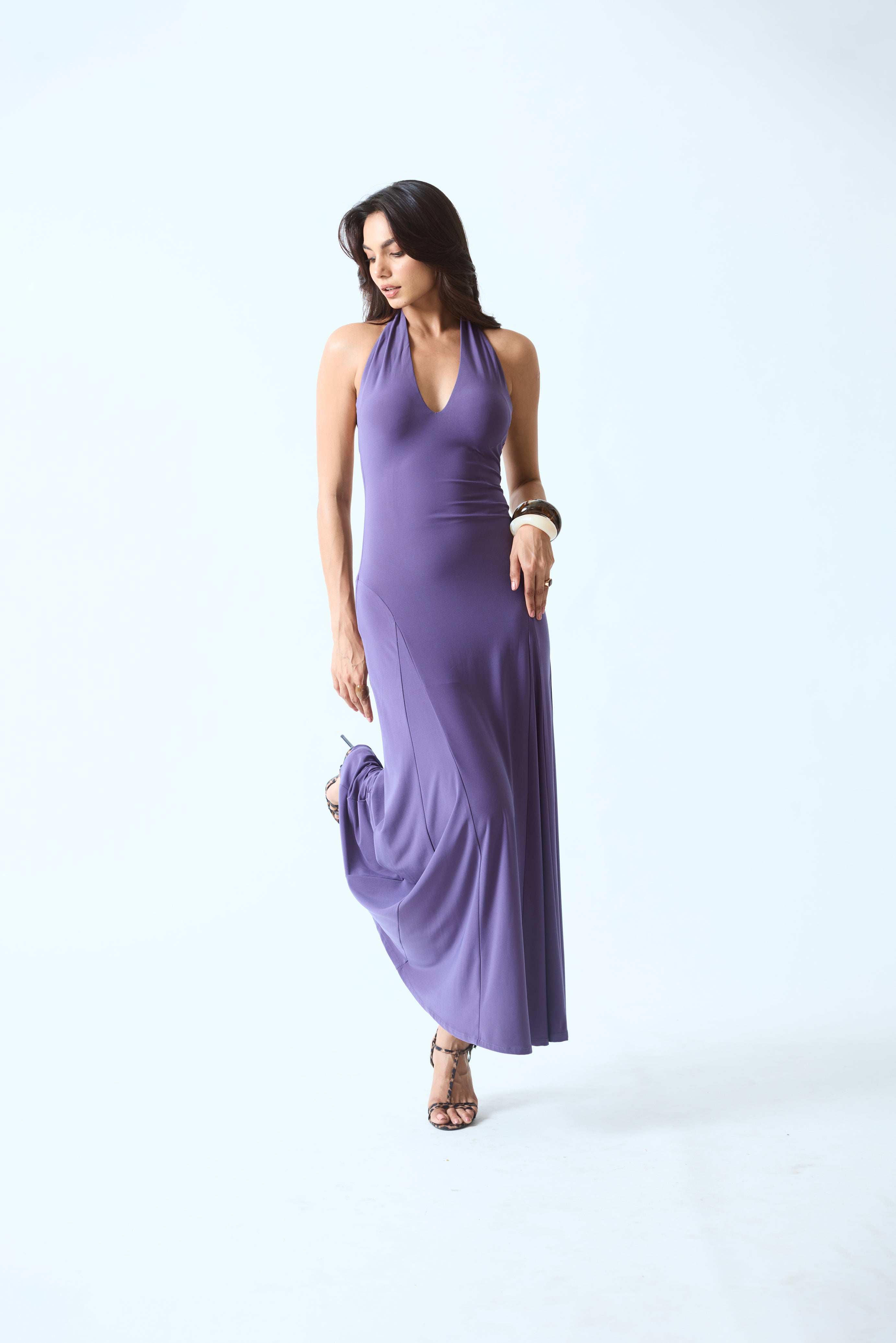 A sleek halter dress designed to sculpt the waist while flowing effortlessly. Featuring a deep halter neckline and an open back, the silhouette transitions into a soft flared hem for graceful movement.