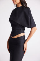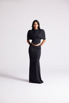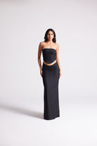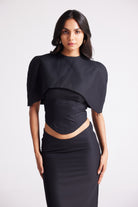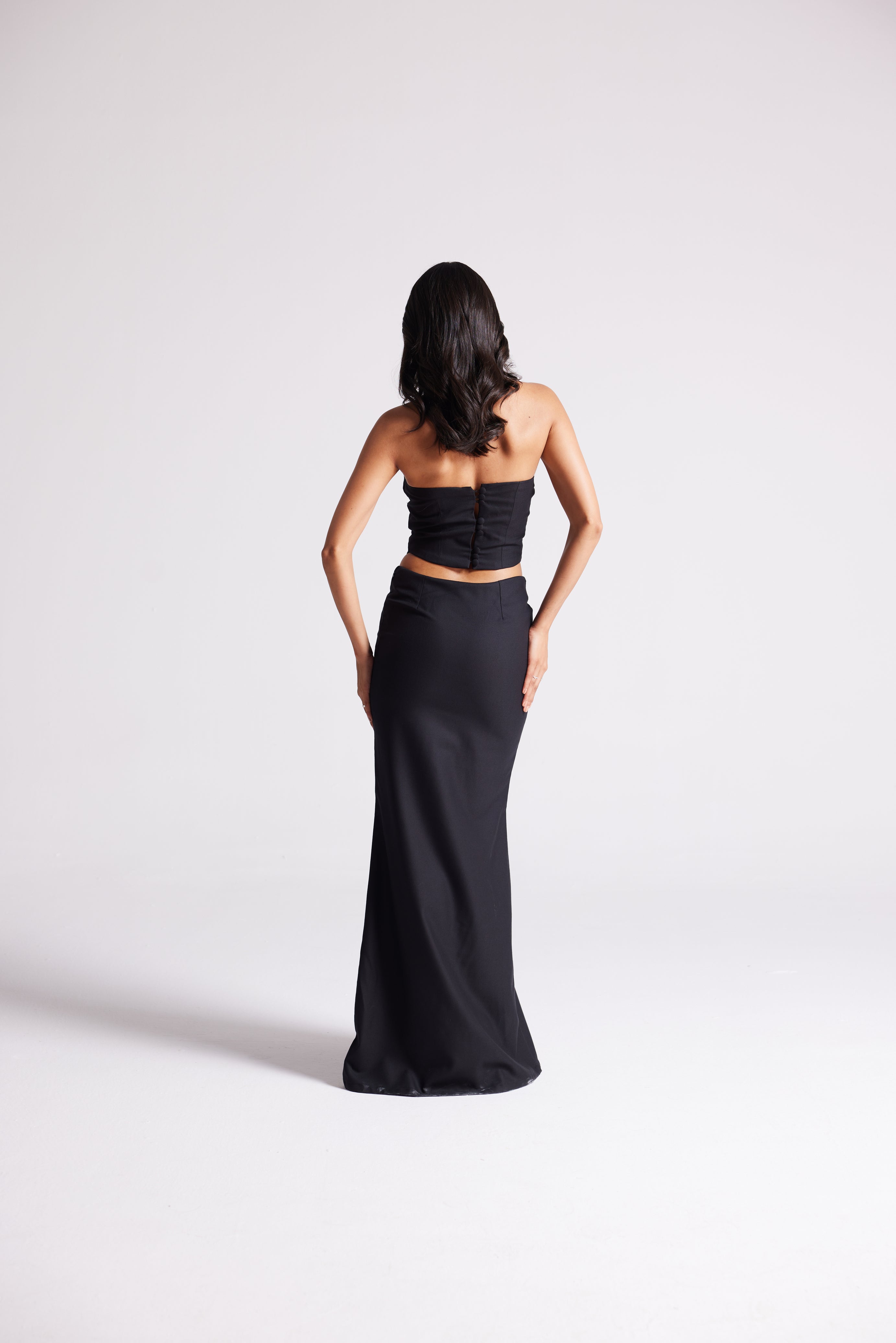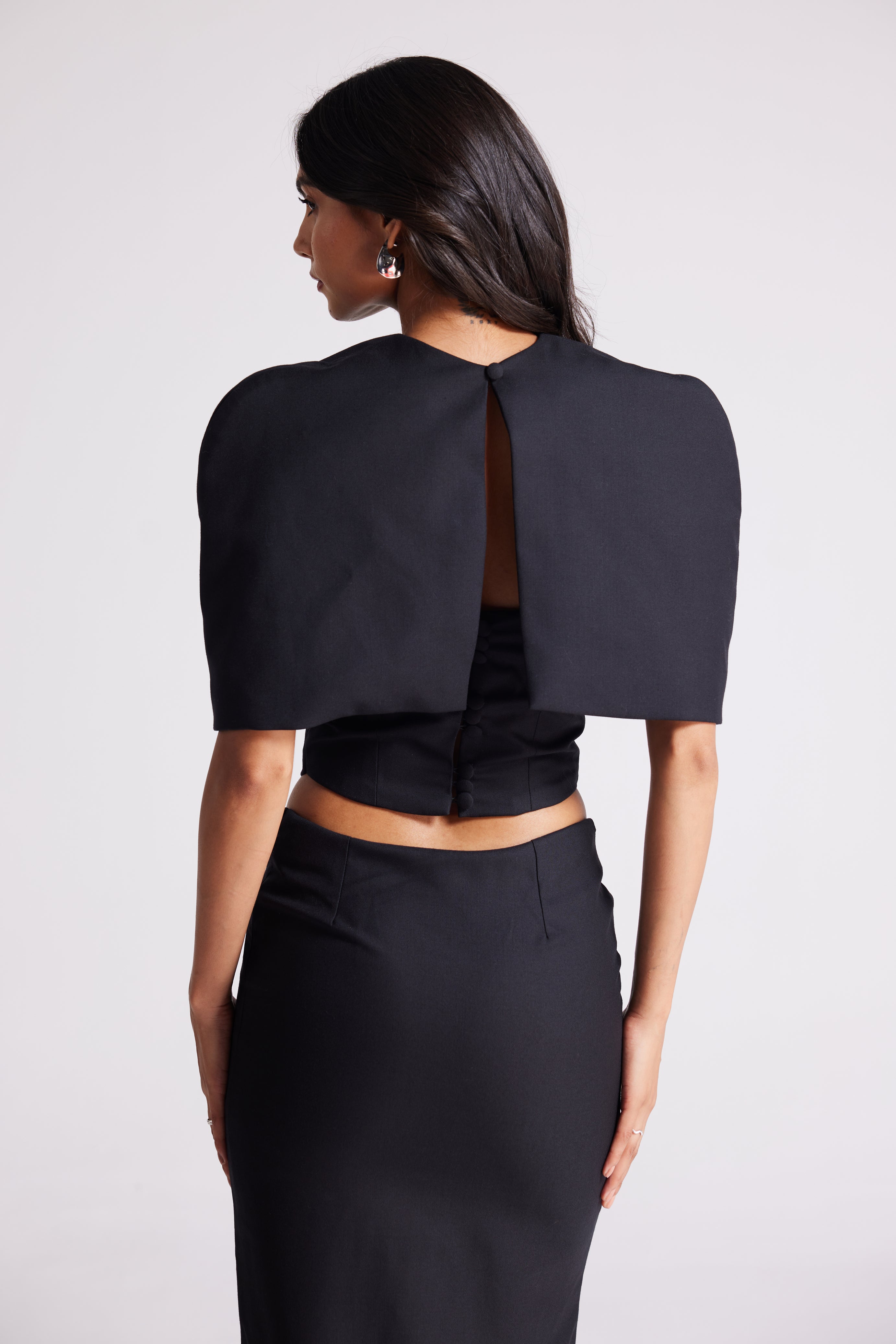 A sleek three-piece look featuring a sculpted crop top, detachable cape, and floor-length skirt. Detailed with covered button accents, this versatile set can be styled minimal or dramatic—making it your go-to for statement evenings.