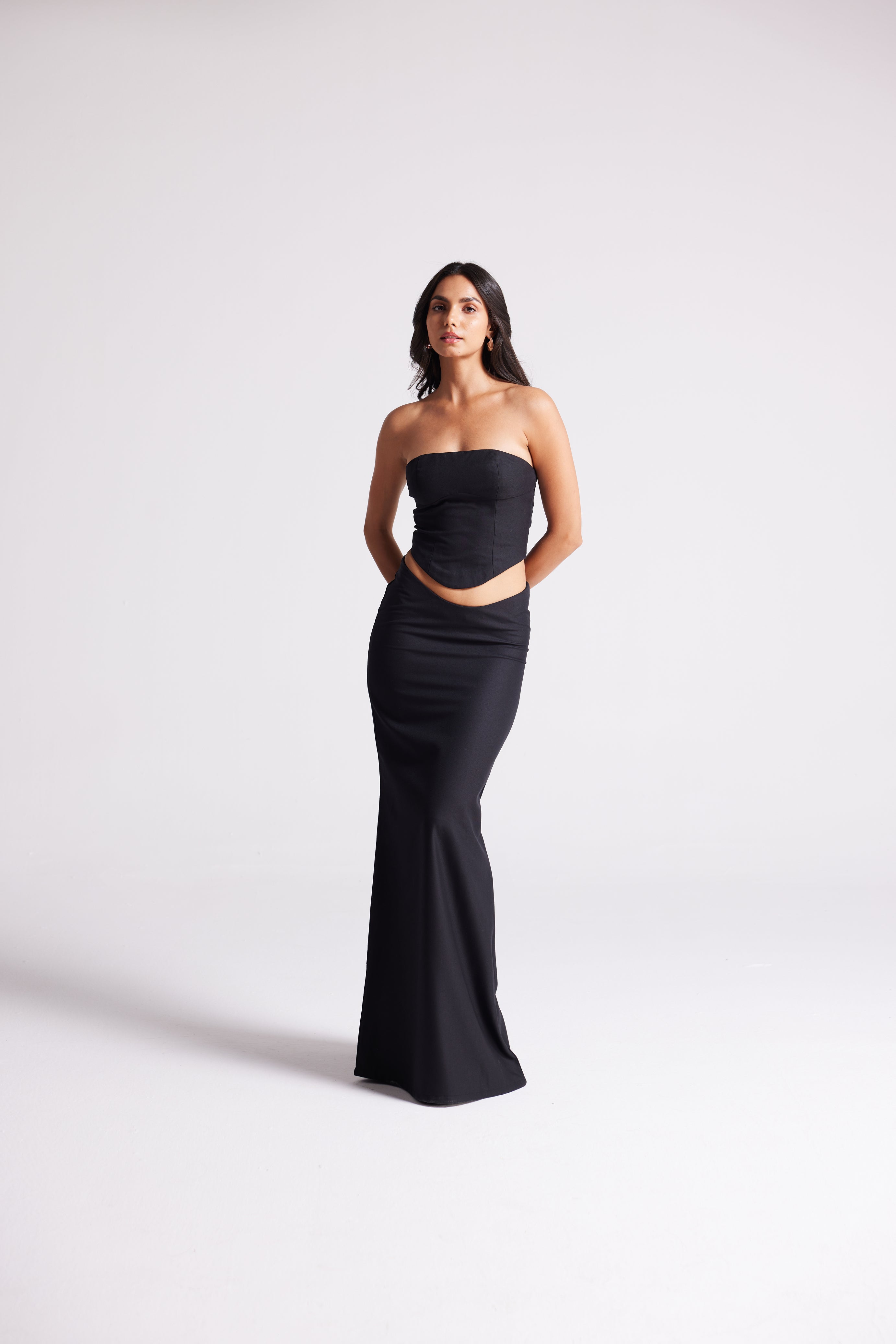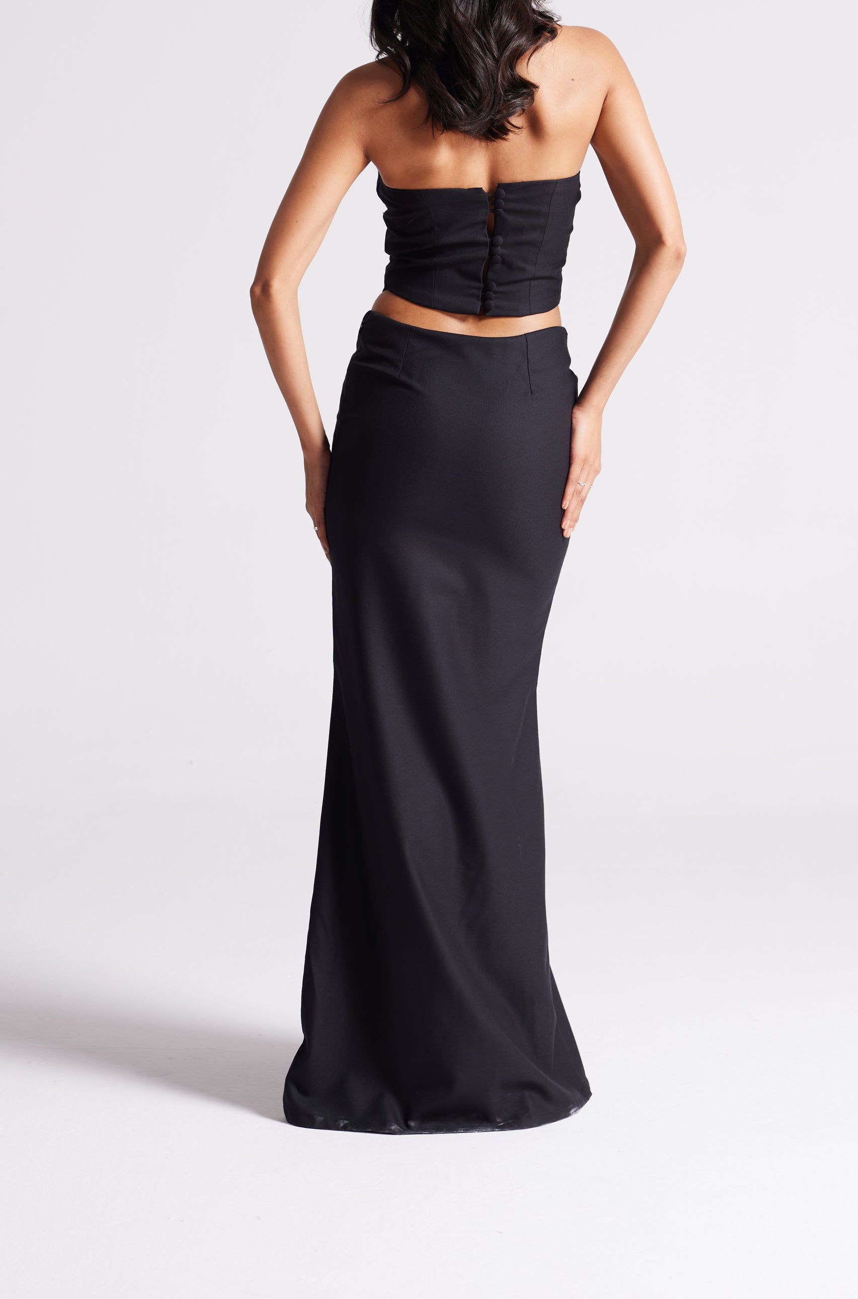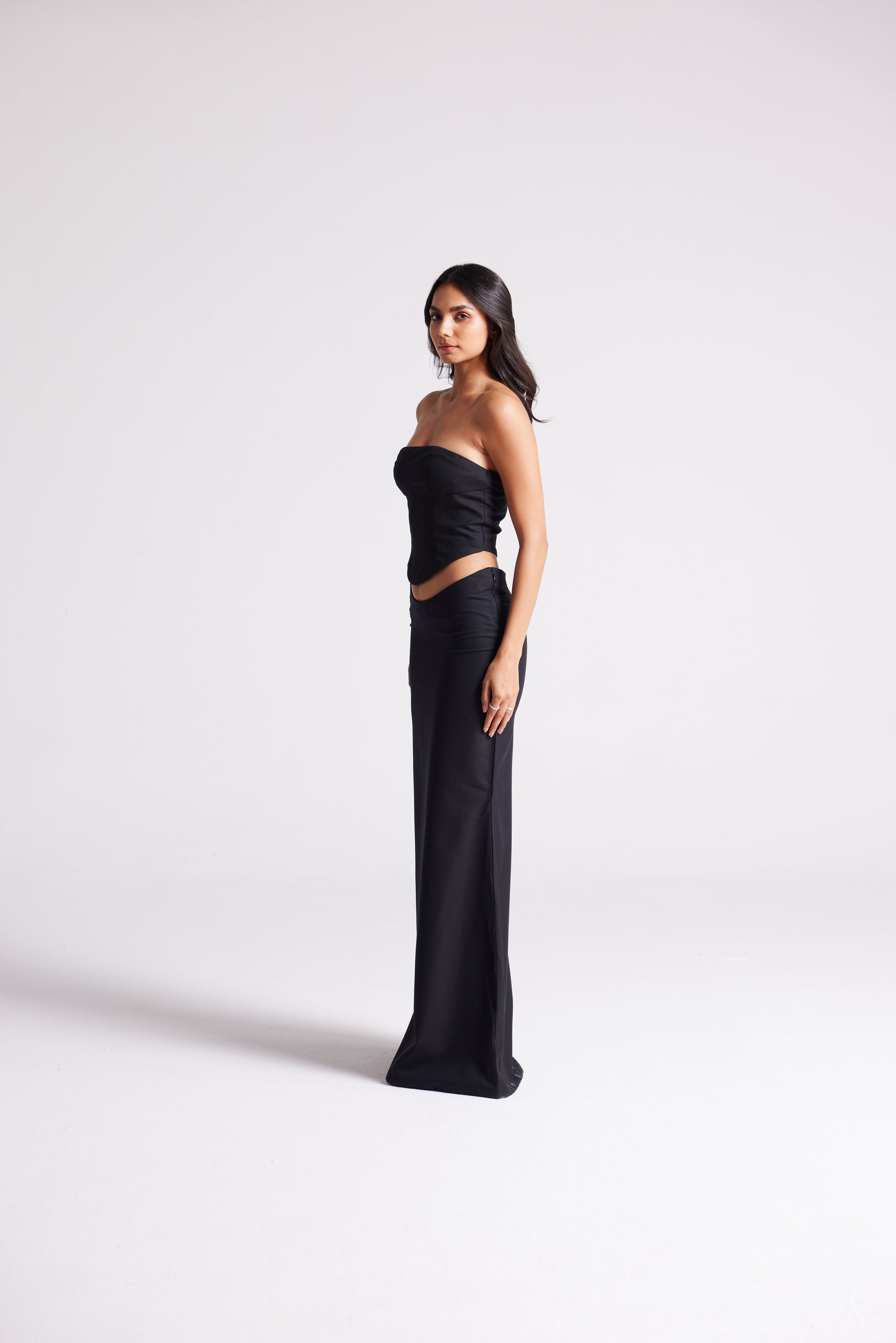 A floor-length, high-waist skirt with a sleek, streamlined silhouette. Cut to move fluidly while maintaining sharp structure, it’s the perfect balance of elegance and modern edge.