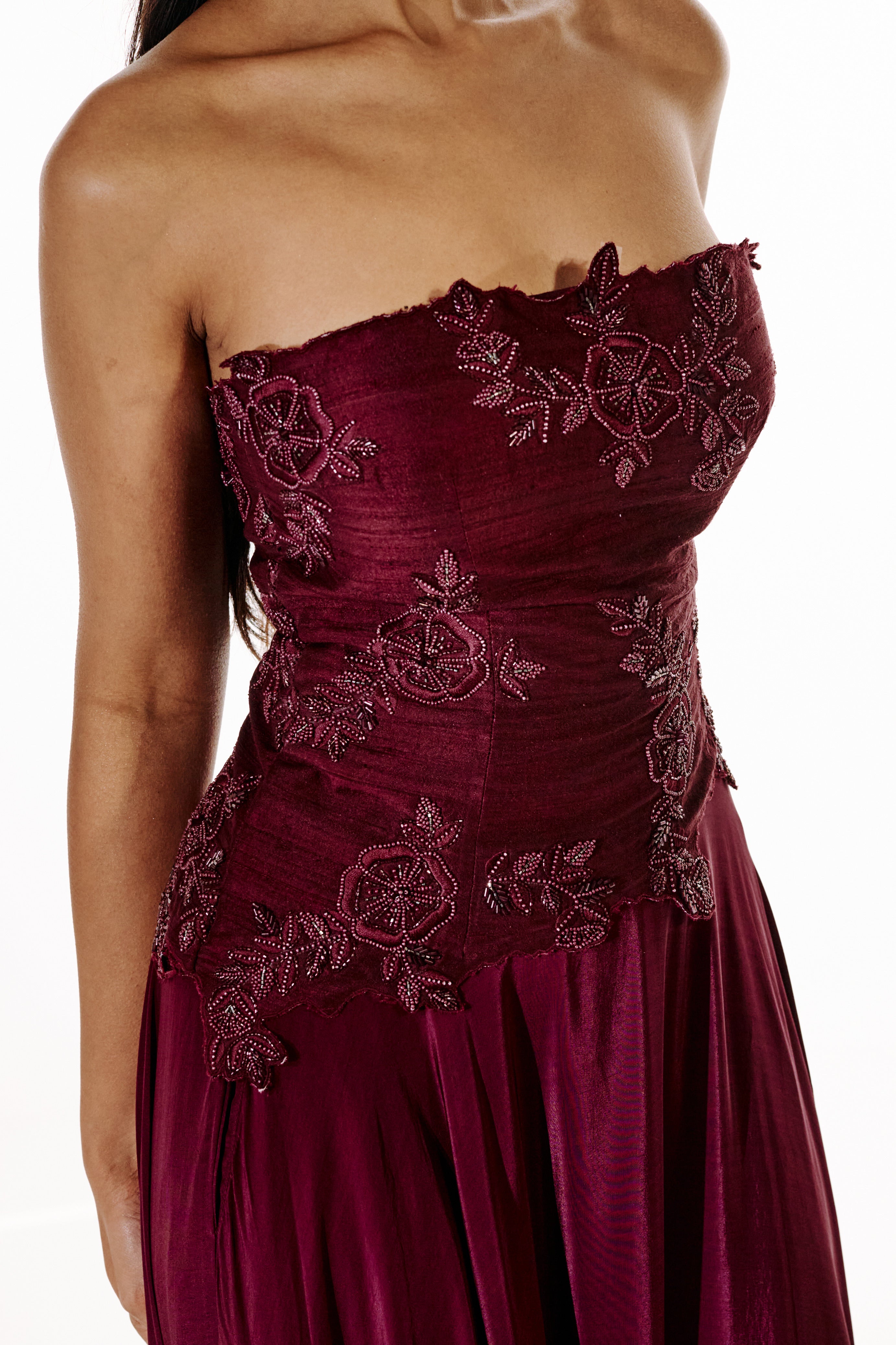 An asymmetrical strapless corset crafted with all-over embroidery, uneven neckline and a contoured fit.