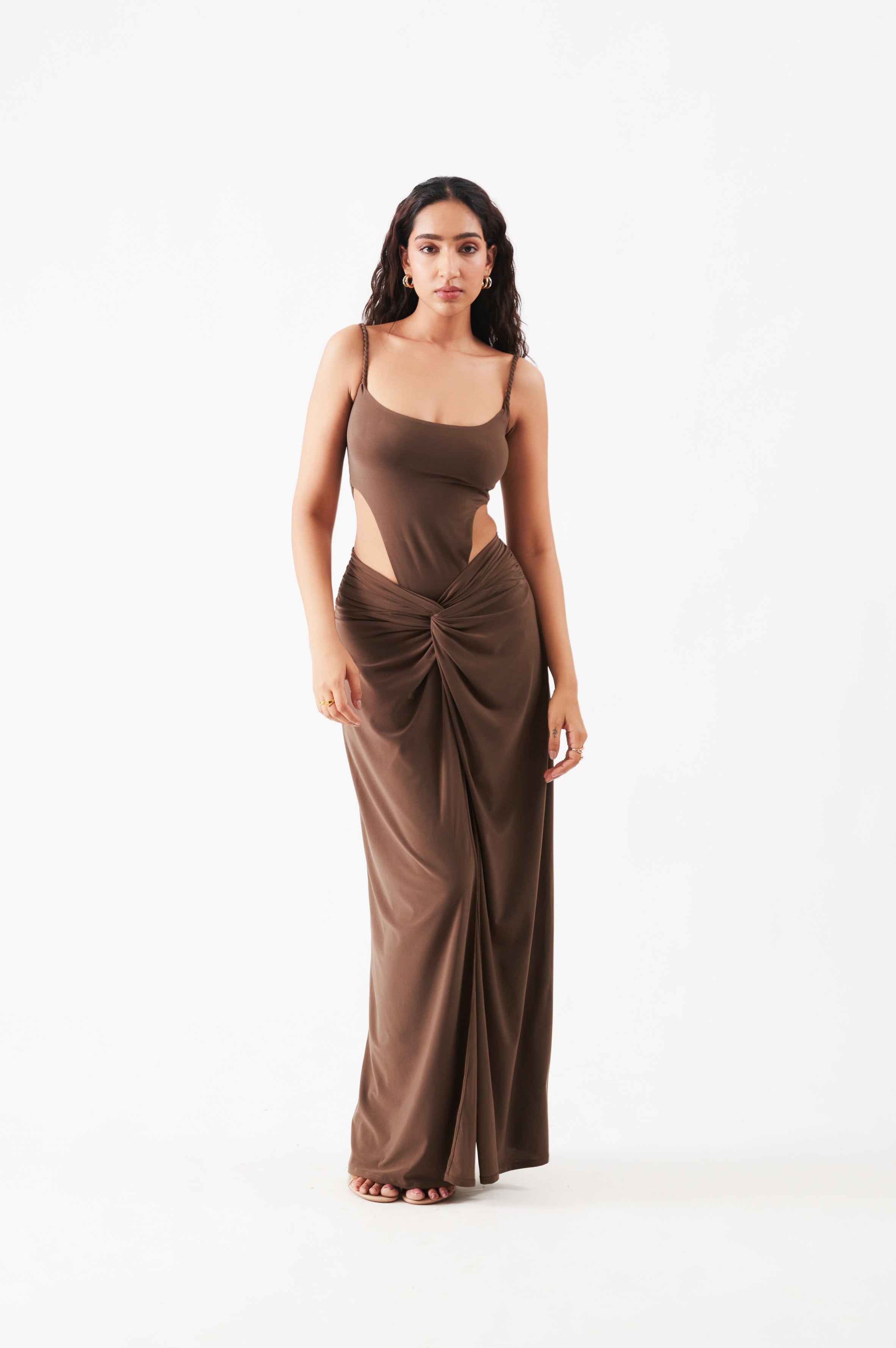 Bodycon bodysuit with a straight neckline and braided, tie up cords for straps. Deep U shaped back.