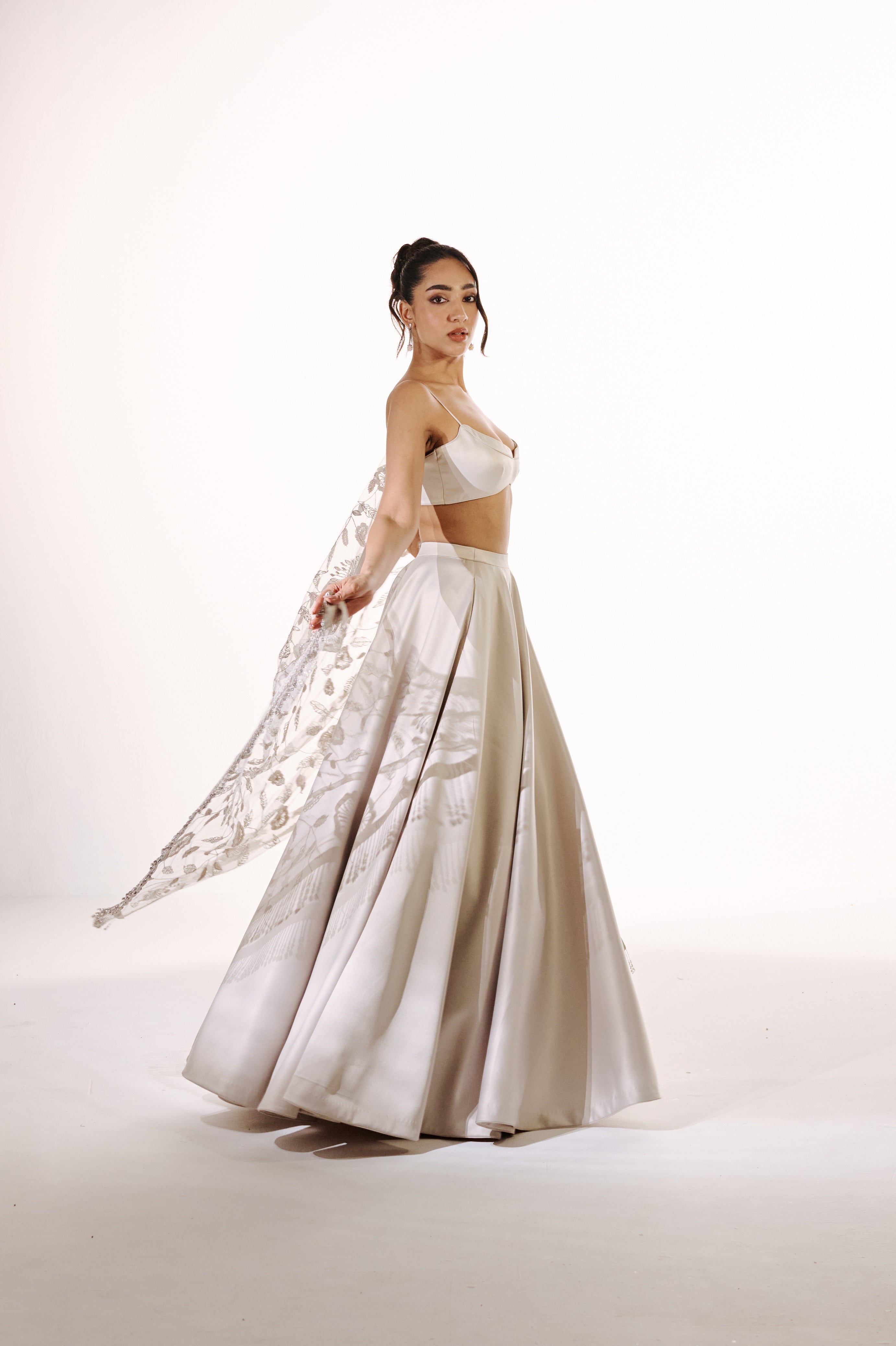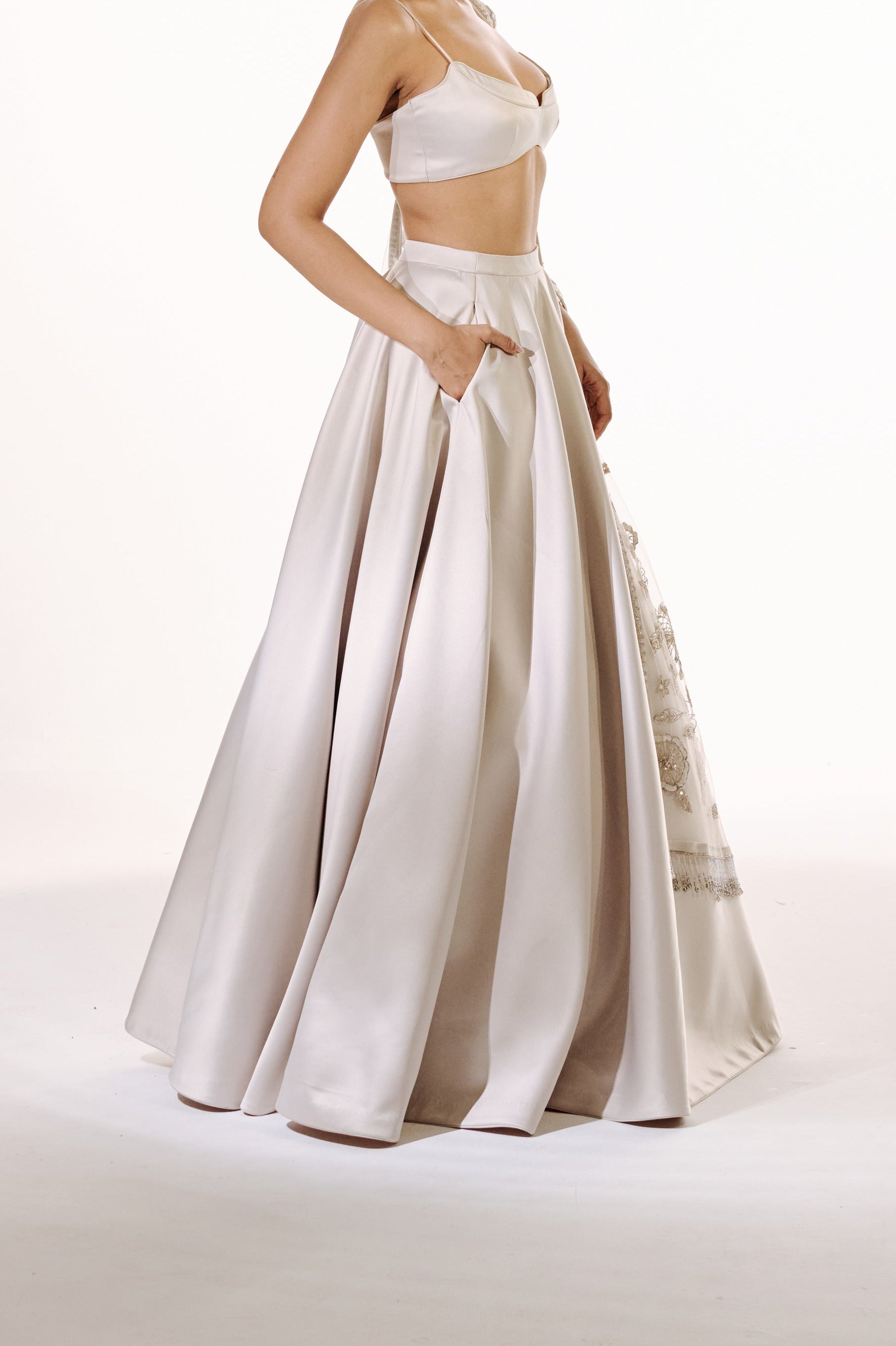 Yashvika wears a custom sample closest to S/8 — High Waist: 24", Mid Waist: 26", Hip: 38.5", Skirt Length: 46".